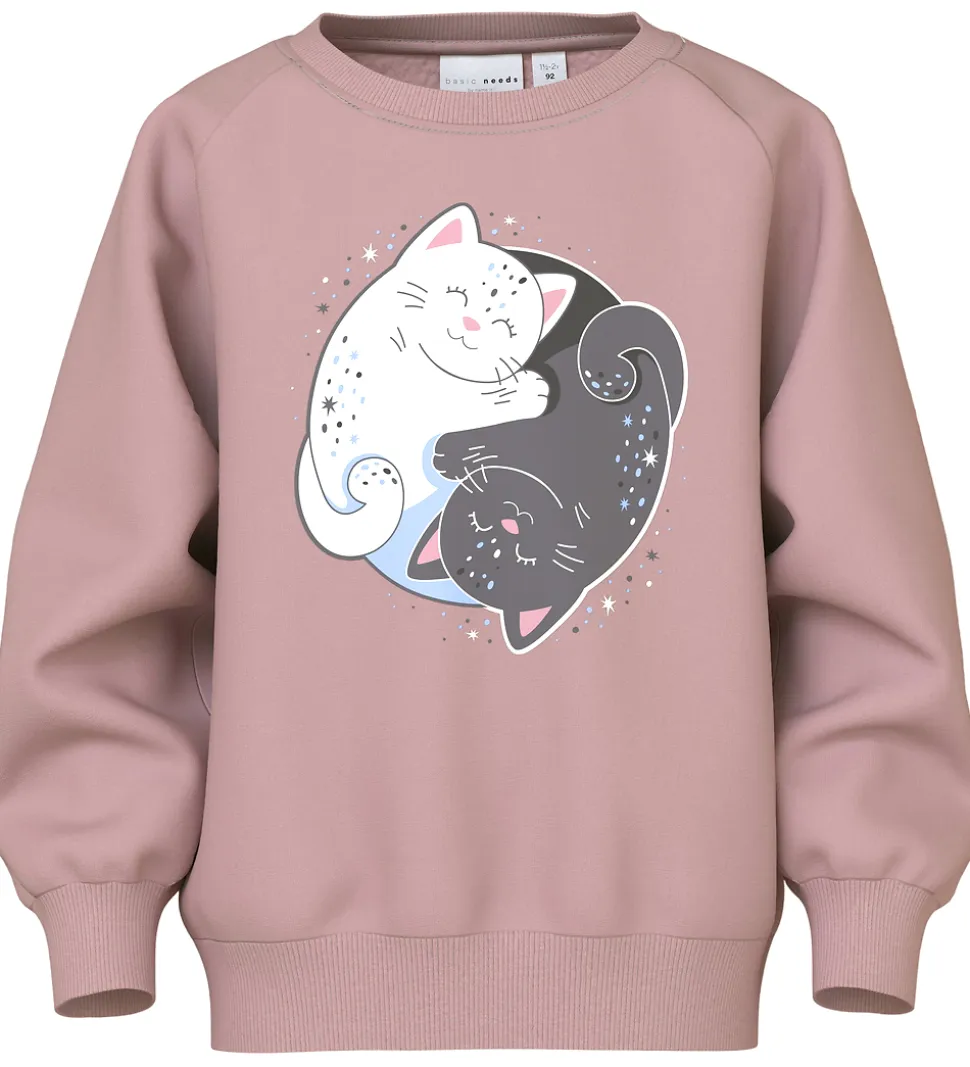 Charmerende Name It sweatshirt i en blød, rosa nuance med et sødt kattemotiv. Sweatshirten har lange ærmer og en rund halsudskæring, der sikrer et enkelt og moderne udtryk.
