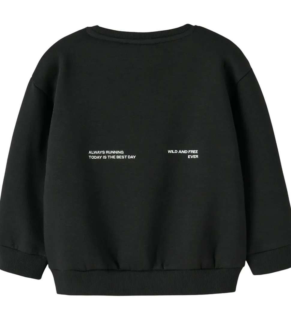 Stilren Name It sweatshirt i sort med teksten “Everyday Essentials” i hvid på venstre bryst. På ryggen er der hvidt tekstprint i siderne. Name It sweatshirten har lange ærmer, rund hals og ribkanter, som tilføjer et moderne og enkelt udtryk. Indvendigt er der blødt, børstet bomuld.