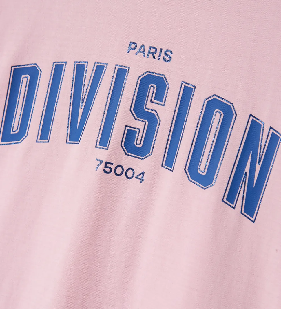 Flot Name It t-shirt i lyserød. T-shirten har et stort tekstprint på fronten med teksten “Paris Division 75004” i blå med glimmer. Name It t-shirten har en klassisk rund halsudskæring, som er afsluttet med en smal ribkant.
