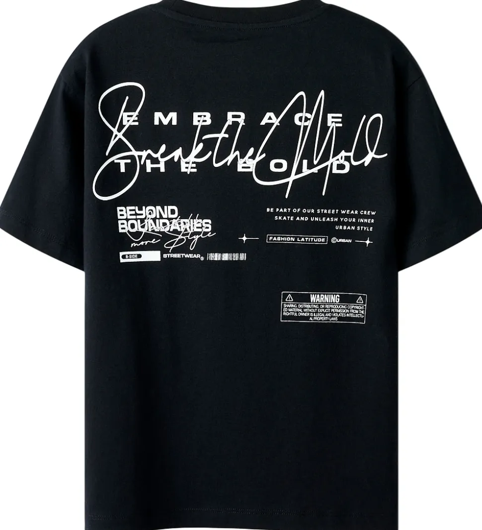 Sej Name It t-shirt i sort med hvidt tekstprint på venstre bryst og på ryggen. Name It t-shirten har en rund halsudskæring med en smal ribkant og korte ærmer.