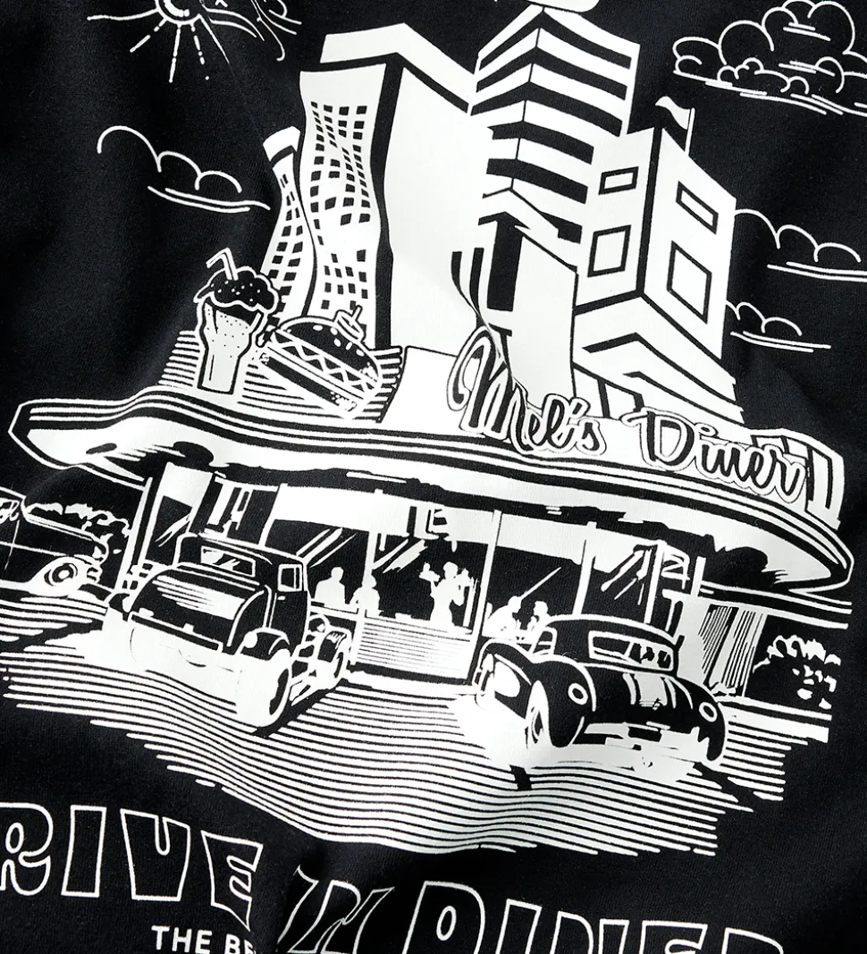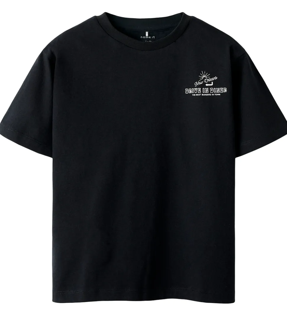 Smart Name It t-shirt i sort med hvidt print på brystet med teksten “Drive In Diner” og en lille grafisk detalje. På ryggen er der et stort, hvidt print af en diner samt tekstprint. Name It t-shirten har en rund halsudskæring med en smal ribkant og korte ærmer.