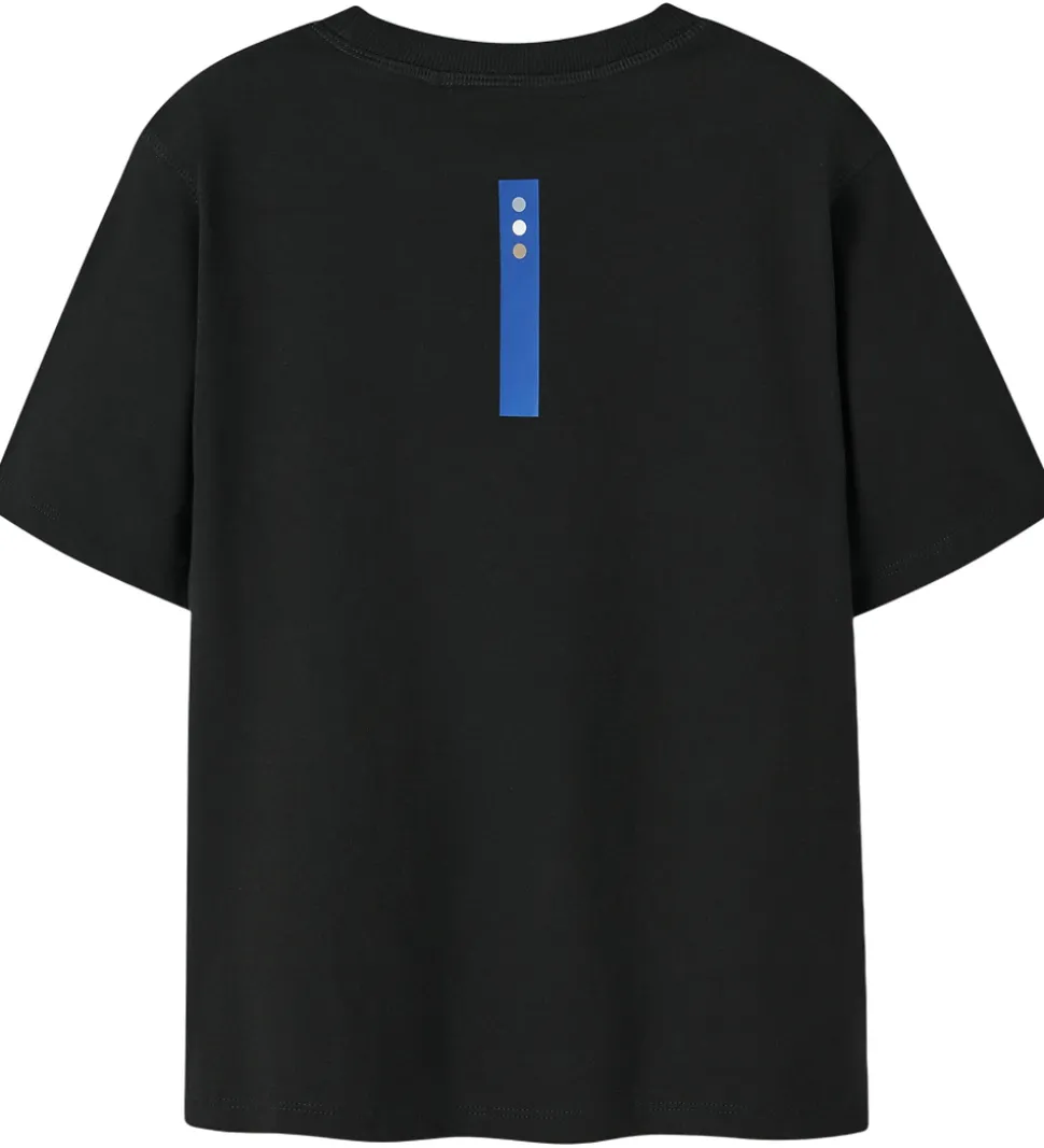 Moderne Name It t-shirt i sort med et dekorativt print på fronten i hvid og blå. På ryggen er der en blå detalje. T-shirten har en rund halsudskæring med ribkant.