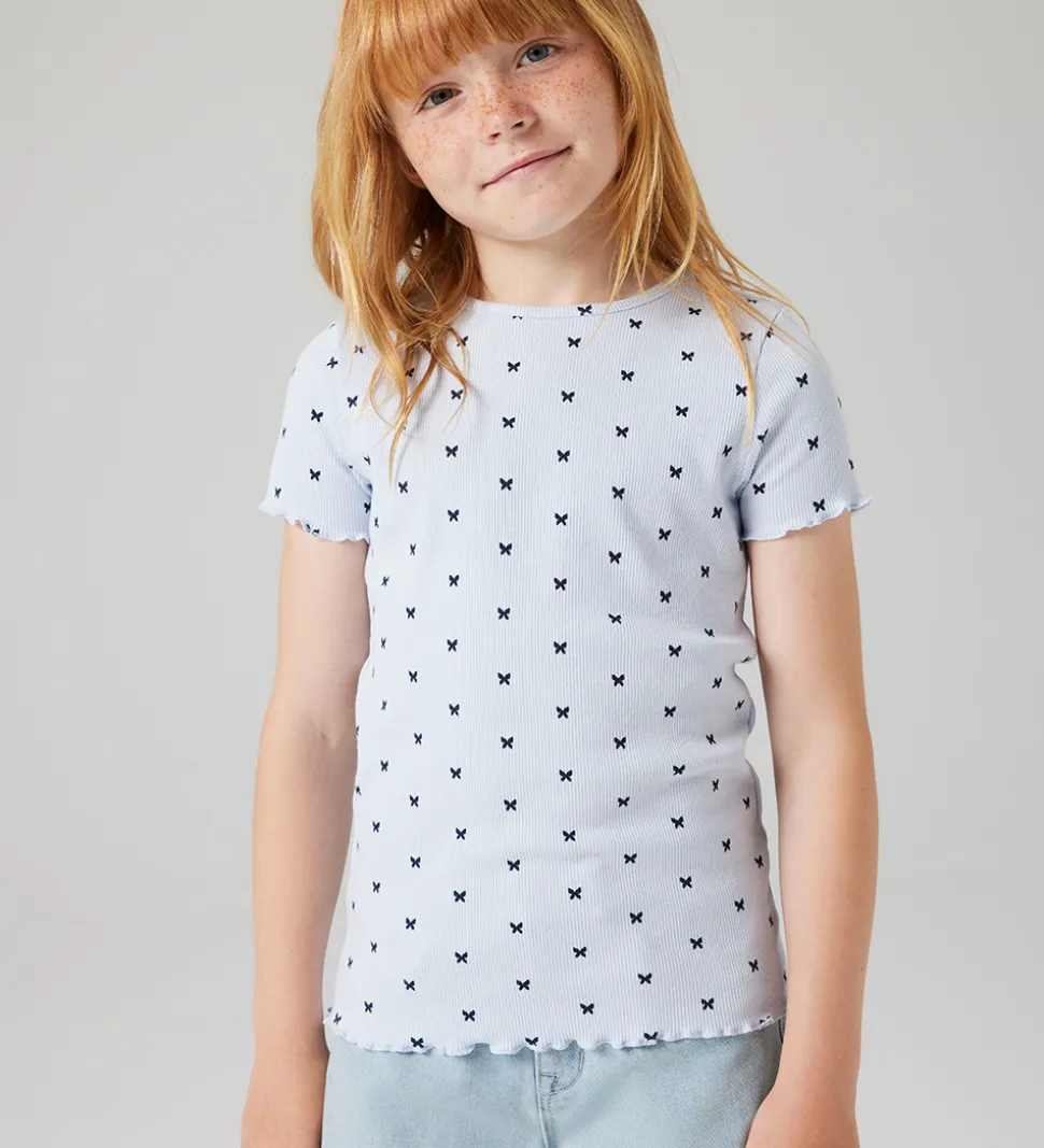 Charmerende Name It t-shirt i lyseblå med et alloverprint af små, sorte sommerfugle. T-shirten har ribstruktur og en rund halsudskæring. I ærme- og taljeåbning er der fine, bølgede kanter.