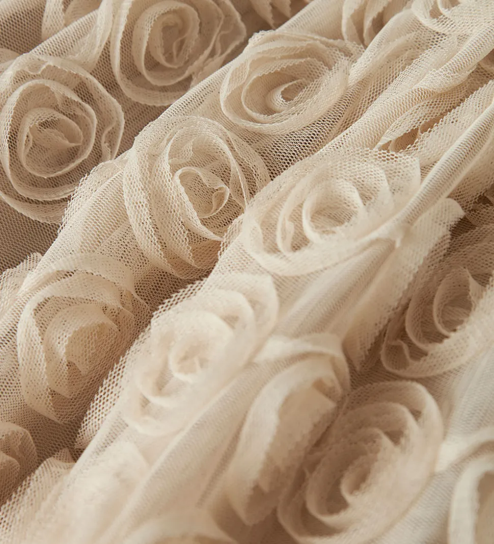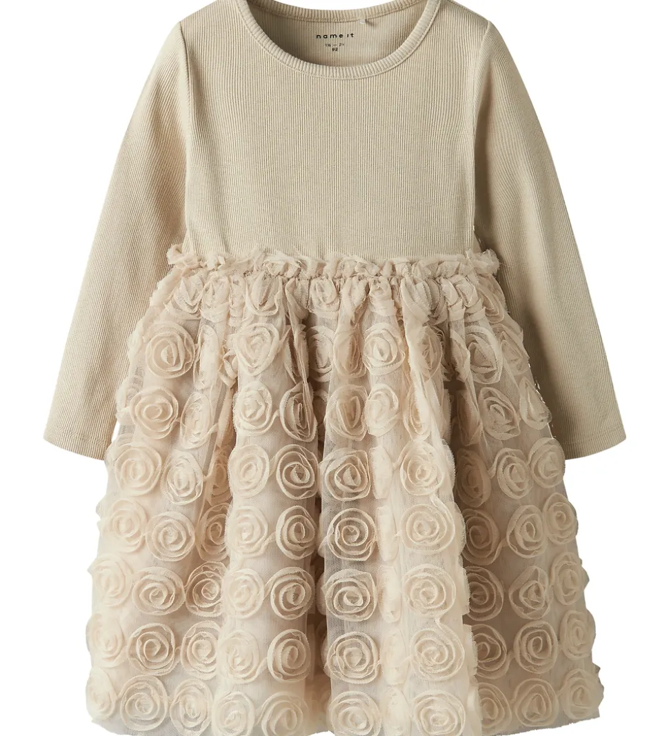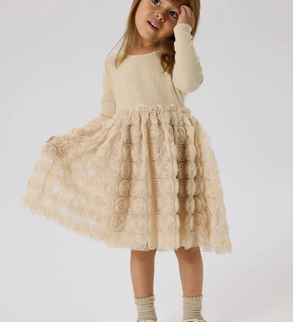Fin Name It kjole i ensfarvet lys beige. Name It kjolen har lange ærmer, og toppen er lavet af blødt bomuld med rbstruktur. Nedenunder falder tylskørtet med masser af vidde, og det er dekoereret med massvis af roser lavet af tyl.