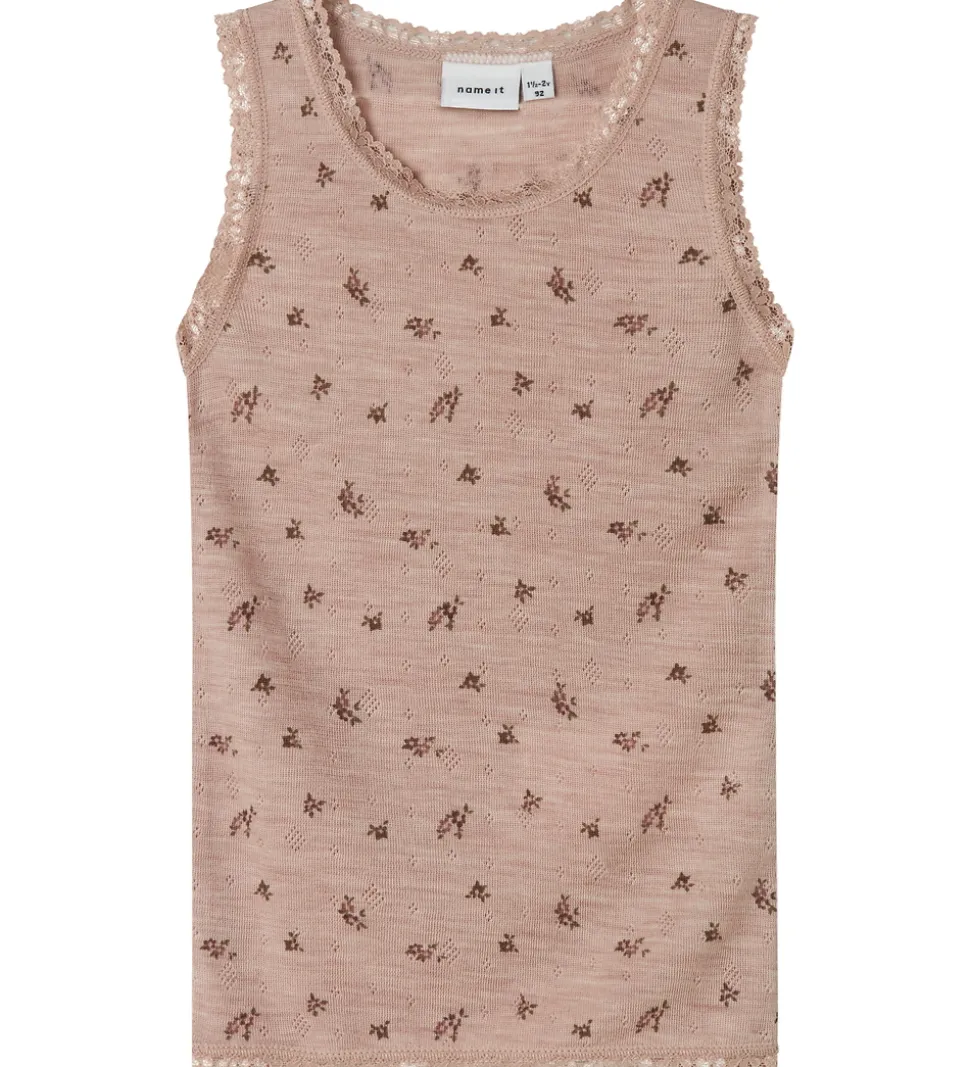 Sød Name It undertrøje i støvet rosa med blomsterprint og fint hulmønster samt blondekanter i hals- og ærmeåbninger. Undertrøjen har en rund halsudskæring og brede skulderstropper. Den er fremstillet i blødt og åndbart merinould.