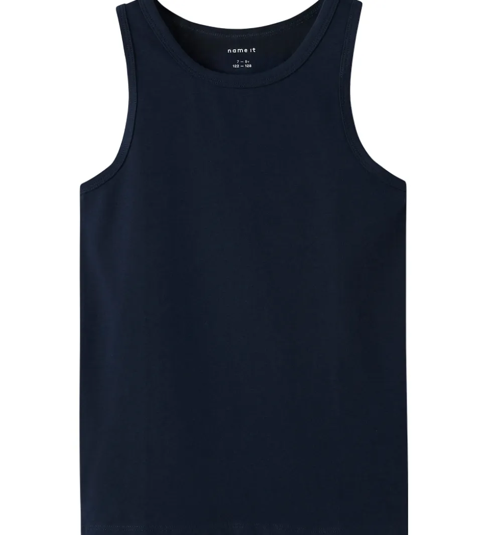 Smarte Name It undertrøjer i en 2-pak, en i mørkegrå med print og en ensfarvet mørkeblå. Begge undertrøjer har brede stropper og rund hals. Name It sikrer en stilfuld og praktisk løsning til hverdagens behov.