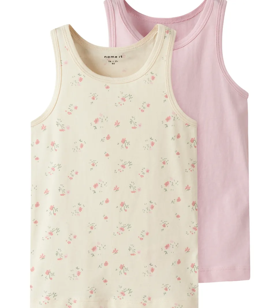 Skønne Name It undertrøjer solgt i en 2-pak. Den ene er cremefarvet med et fint blomsterprint i lyserøde nuancer, mens den anden er ensfarvet lyserød. Name It undertrøjerne har et klassisk snit med brede stropper, der giver dem et tidløst udtryk.