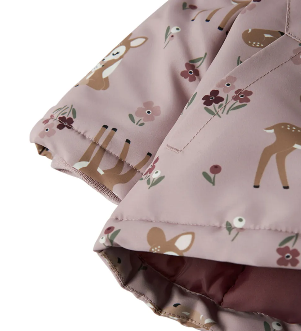 Smuk Name It vinterjakke i en lys, lilla nuance med et yndigt print af rådyr og blomster fordelt over hele stoffet