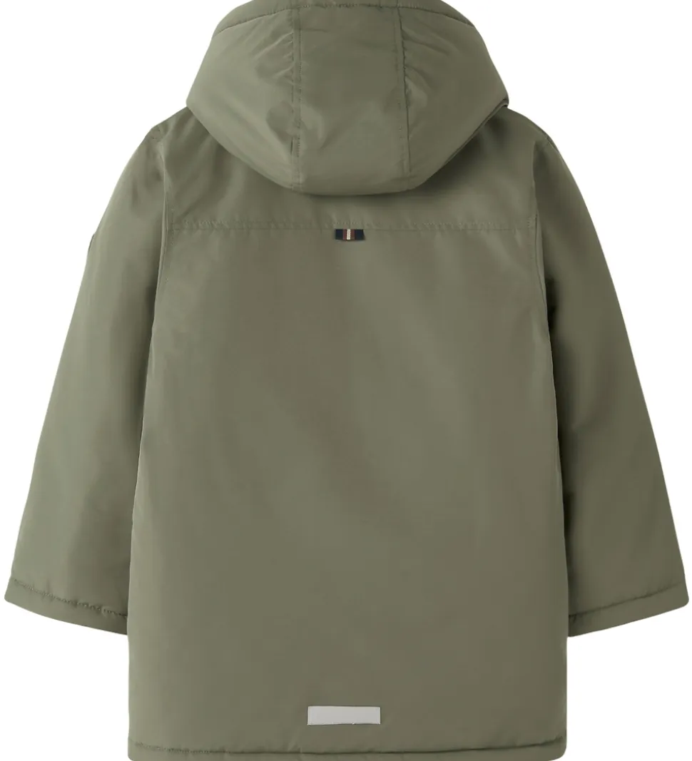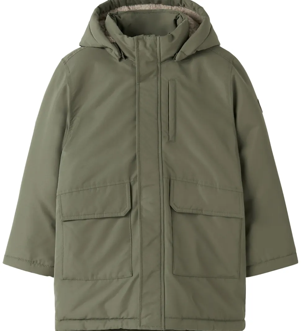 Stilfuld Name It vinterjakke i en flot olivengrøn nuance og med for af beige teddyfleece. Vinterjakken har en praktisk hætte og rummelige lommer, der gør den både funktionel og moderne. Ærmerne har snefang og ribkanter. Name It vinterjakkenjakken er ideel til de kølige årstider.