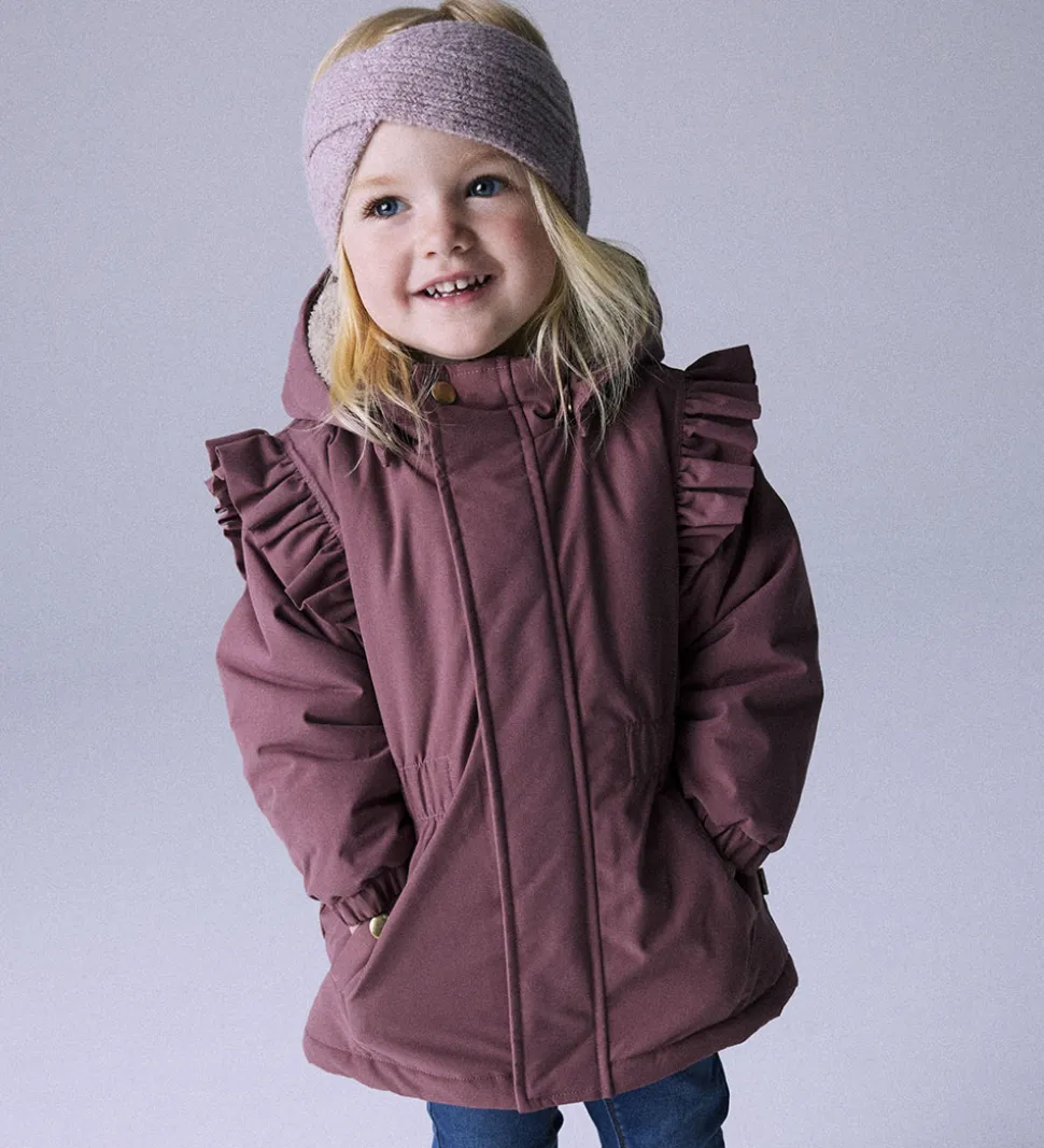 Vinterjakken har to trykknapslommer på fronten, og ærmerne er med elastikkanter. Over skuldrene er der fine flæser.