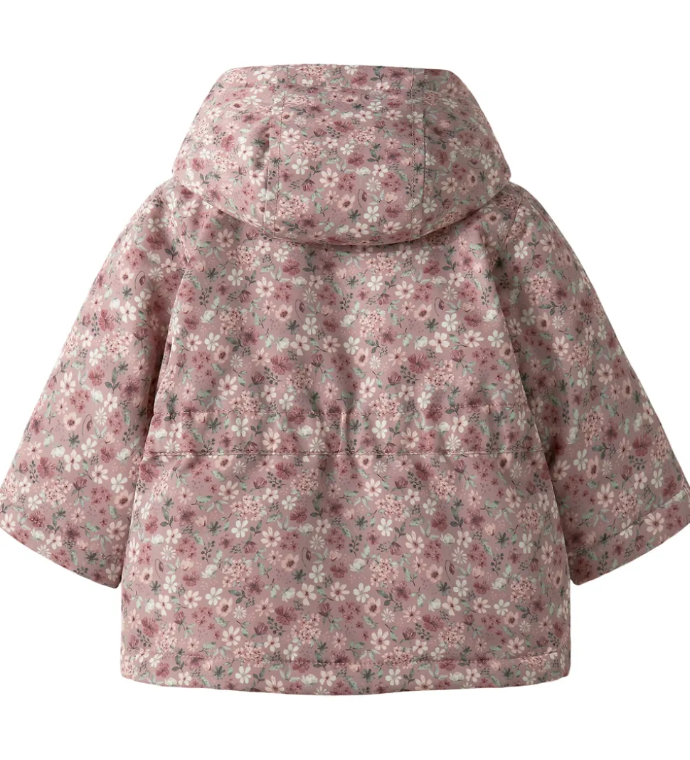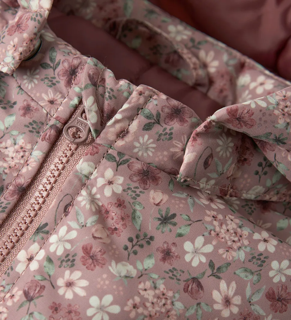 Smuk Name It vinterjakke i støvet rosa med et delikat blomstermønster i hvide og grønne nuancer.