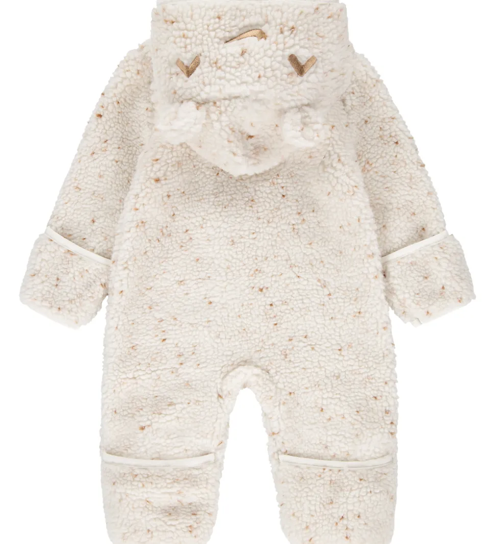 Charmerende fleecedragt fra Nike i en råhvid nuance med bittesmå beige nister, der tilføjer et delikat touch. Nike fleecedragten har en hætte udsmykket med søde øre-detaljer og påsyede grafikker. Den er designet med lange ærmer og ben. Fleecedragten har en praktisk lynlås med hagebeskytter foran, hvilket gør det nemt at få den af og på. På ærmer og ben har dragten ombuk, som holder hænder og fødder varme.
