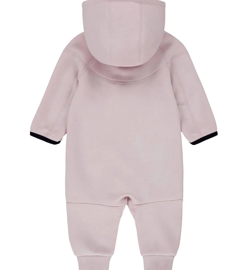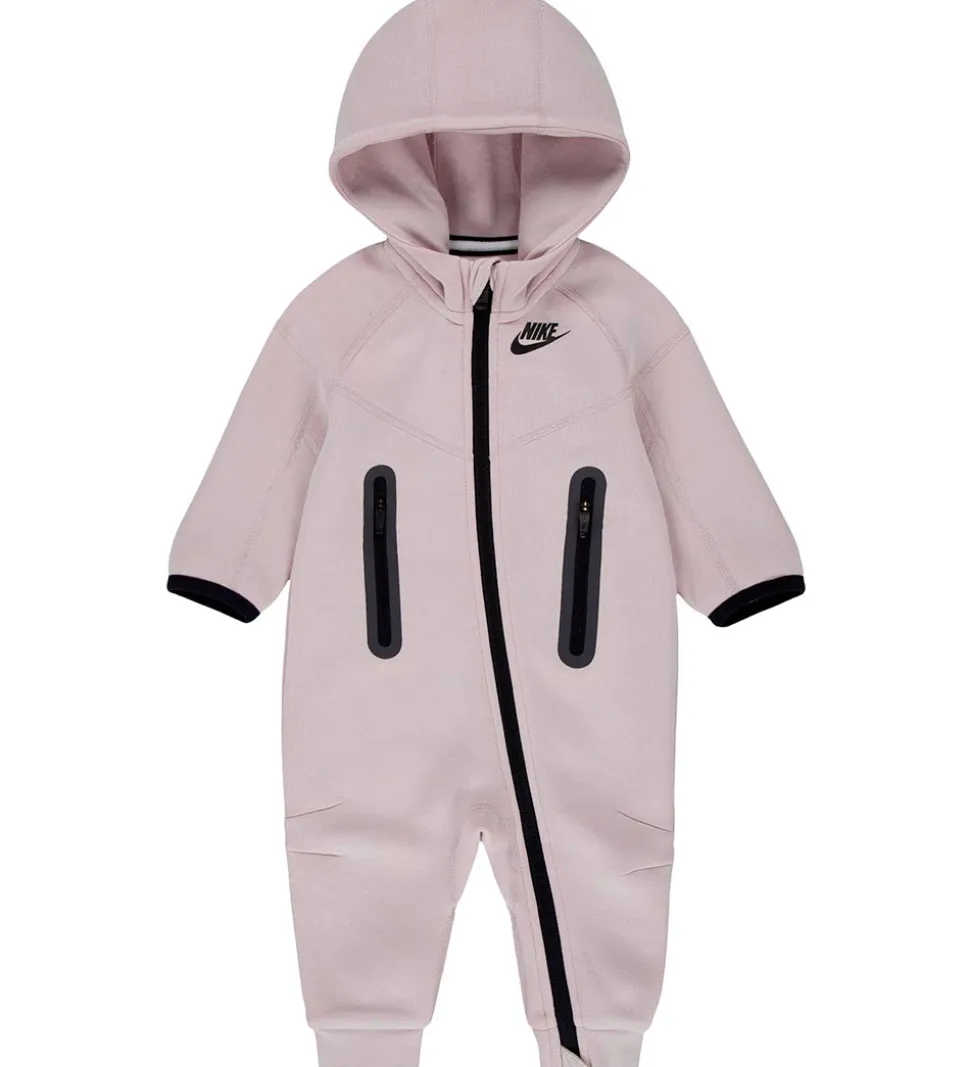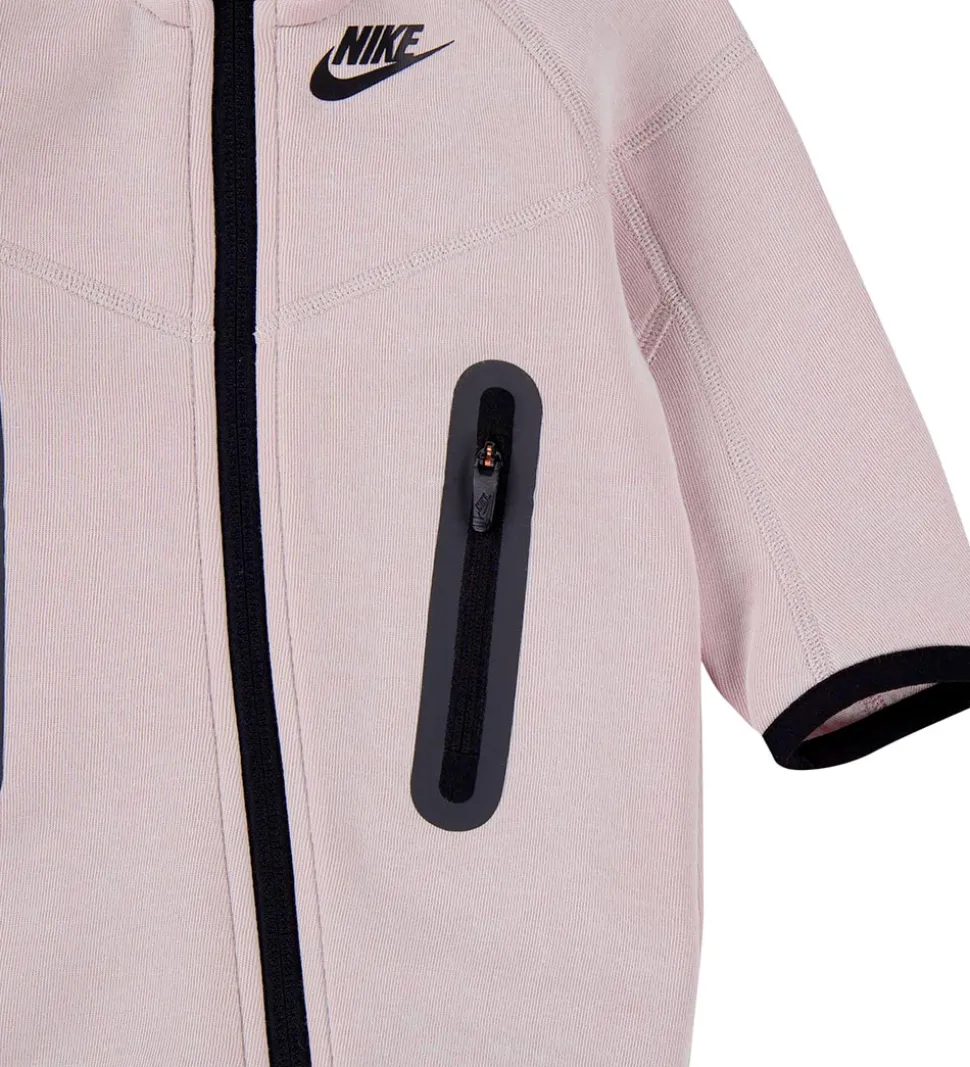 Smart Nike heldragt i lys, støvet rosa med sorte lynlåse, og fortil i venstre side står der “Nike” trykt i sort.