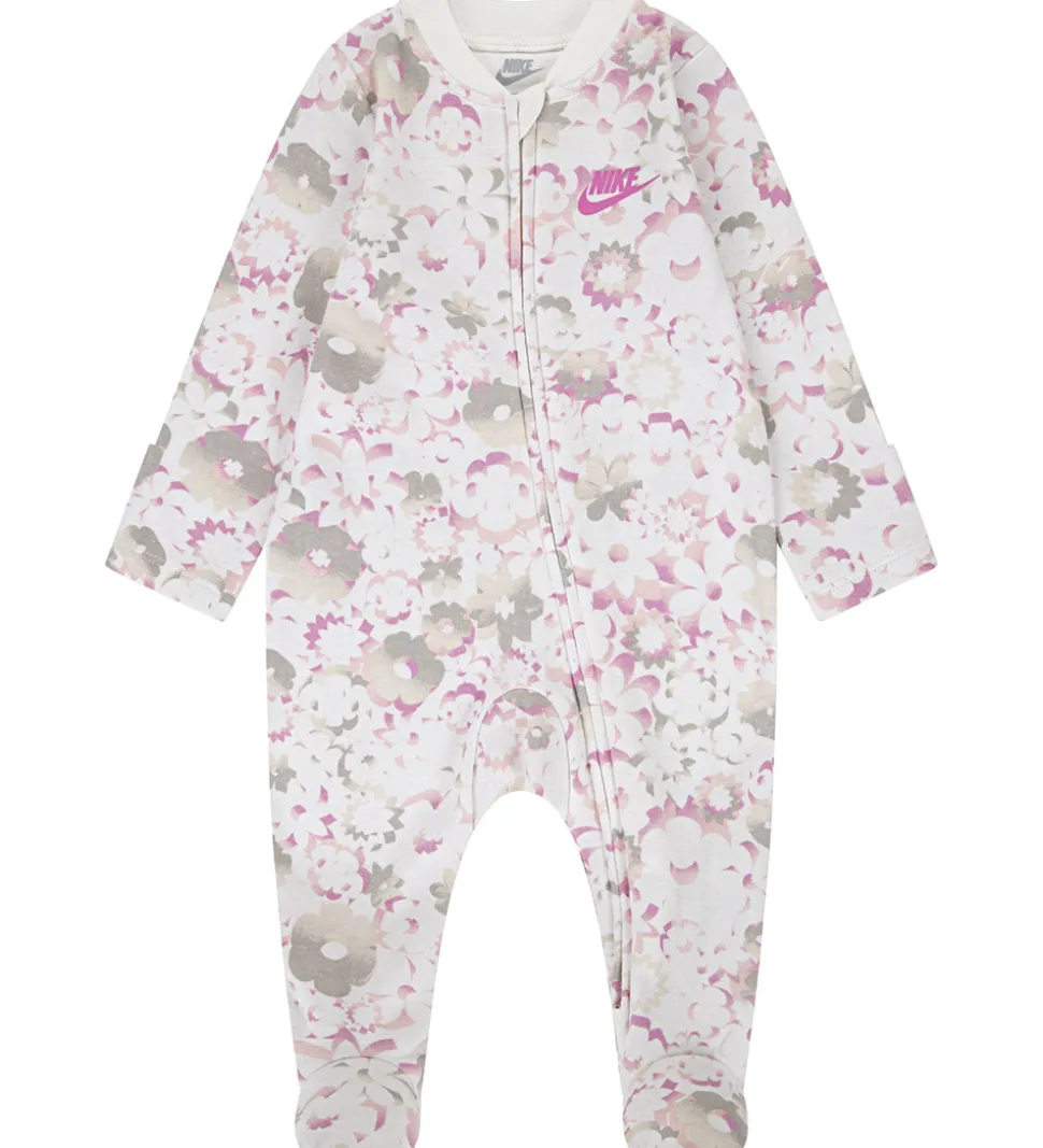 Flot heldragt fra Nike i hvid med et allover blomsterprint i rosa, grå og beige nuancer. På venstre bryst er der et rosa logoprint.