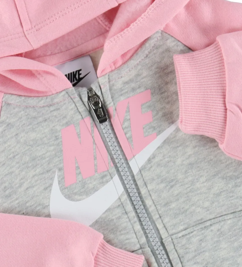 Fint Nike sweatsæt, der består af en cardigan og et par sweatpants i gråmeleret og rosa sweat med hvide detaljer samt en hvid t-shirt med et logoprint.