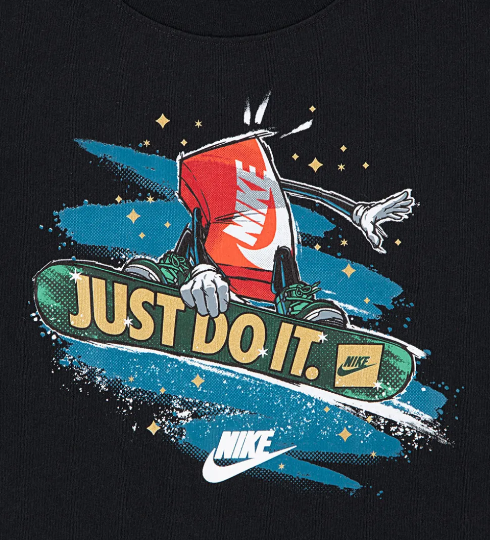 Smart Nike t-shirt i sort. T-shirten præsenterer et farverigt print med en karakter, der står på et skateboard, omgivet af dynamiske stænk i blå nuancer. Centralt på t-shirten ses teksten “Just Do It.” i stor, iøjnefaldende guld skrift. Nike t-shirten har en klassisk rund halsudskæring med en ribkant, der giver den et stilrent look.