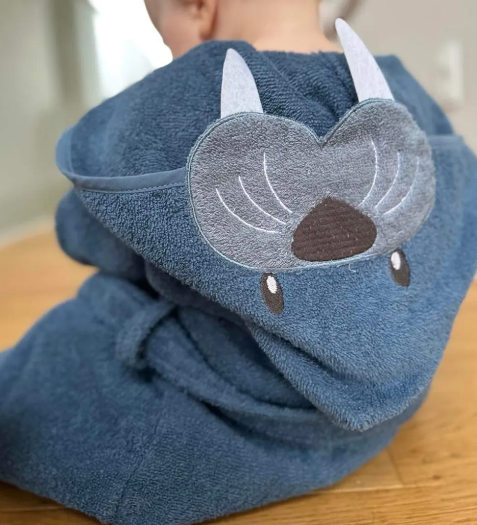 Lækker Nørgaard Madsens badekåbe i blå med en hætte i et hvalrosdesign med støvtænder og broderede træk.
