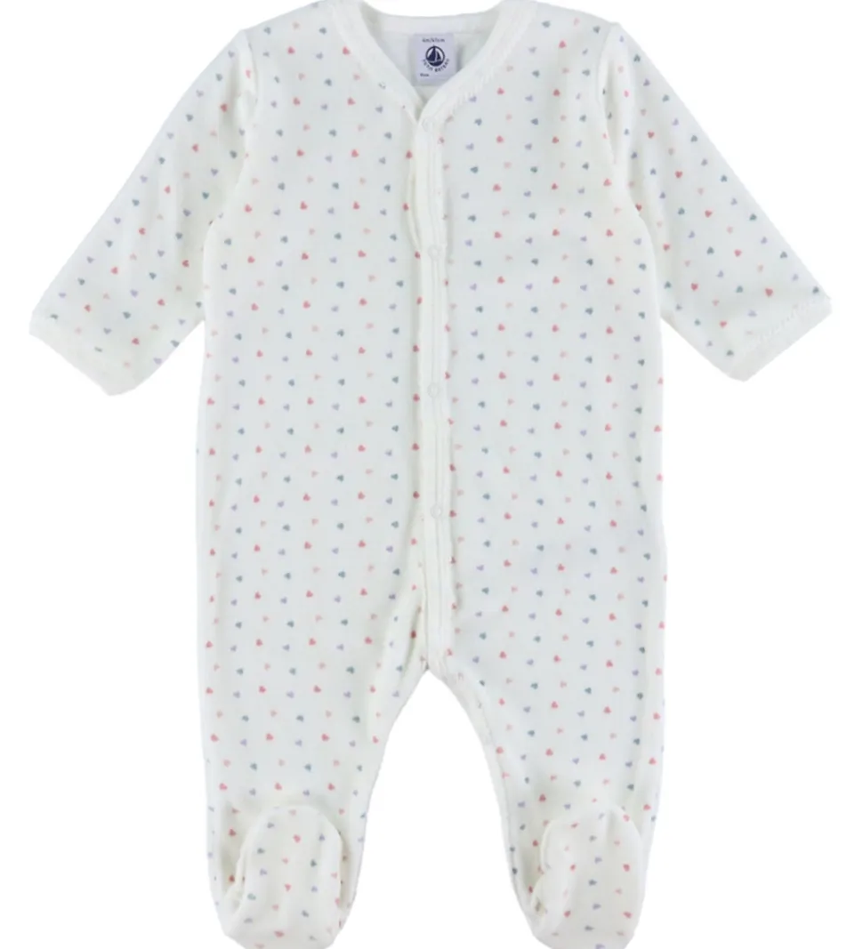 Charmerende natdragter fra Petit Bateau solgt i en praktisk 2-pak med forskellige designs. Den ene natdragt har fine striber i rosa og hvid, og den anden er i en blød velour med et flot alloverprint af små hjerter i nuancer af rosa, blå og lilla samt søde blondedetaljer omkring åbningerne.