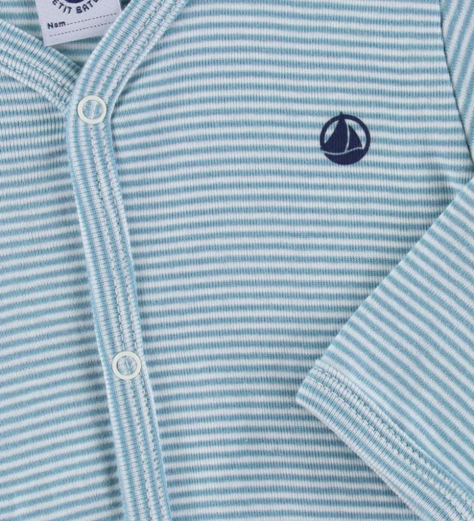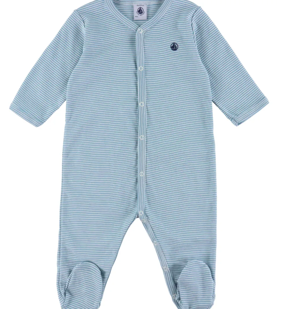 Charmerende Petit Bateau natdragt med smalle striber i blå og hvid, hvilket giver den et klassisk udseende. Et lille logo print i navy fra Petit Bateau pryder venstre bryst.