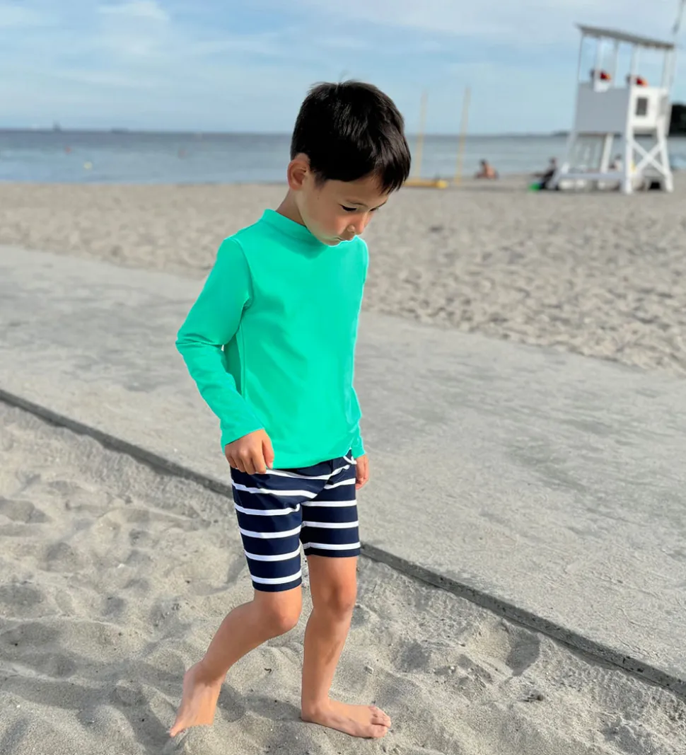 Lækker Petit Crabe badebluse i en frisk grøn med et broderet logo nederst. Badeblusen har lange ærmer og en høj hals.