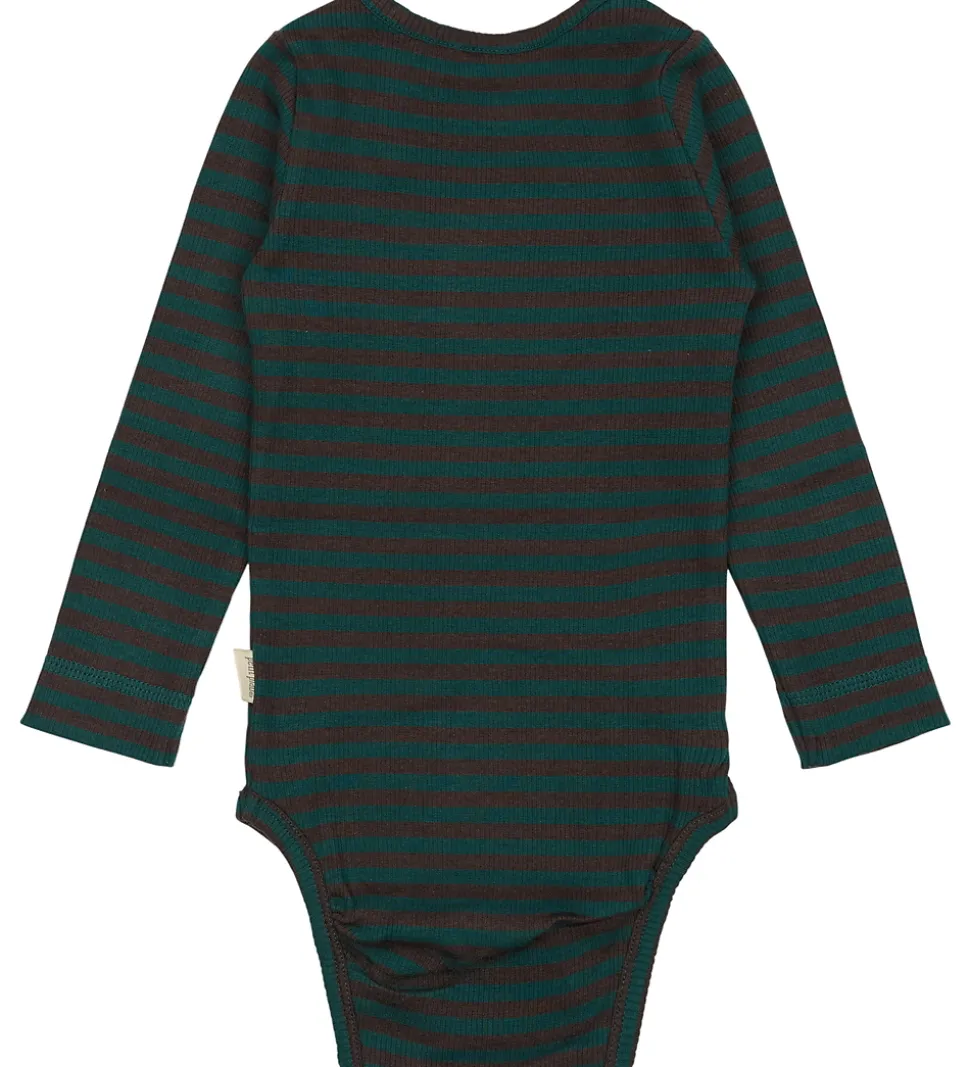 Stilfuld Petit Piao body med lange ærmer i et klassisk, stribet mønster i mørkegrønne og brune nuancer. Bodyen har en fin rund hals og en praktisk lukning ved skulderen. Petit Piao sikrer en god pasform med ribkanter ved ærmerne og i bunden, og lukkes let med trykknapper forneden.
