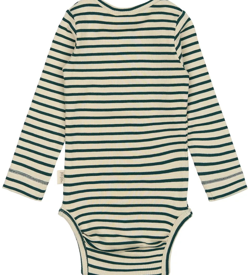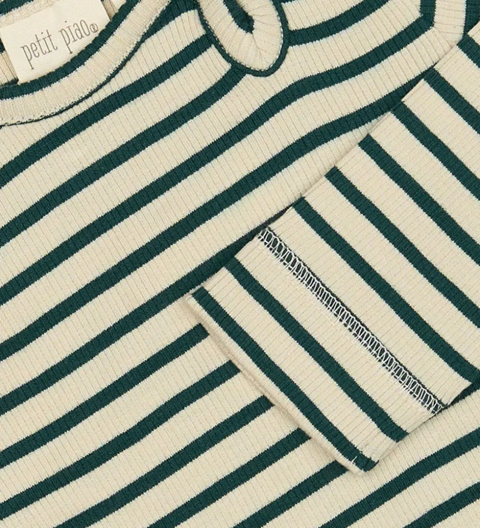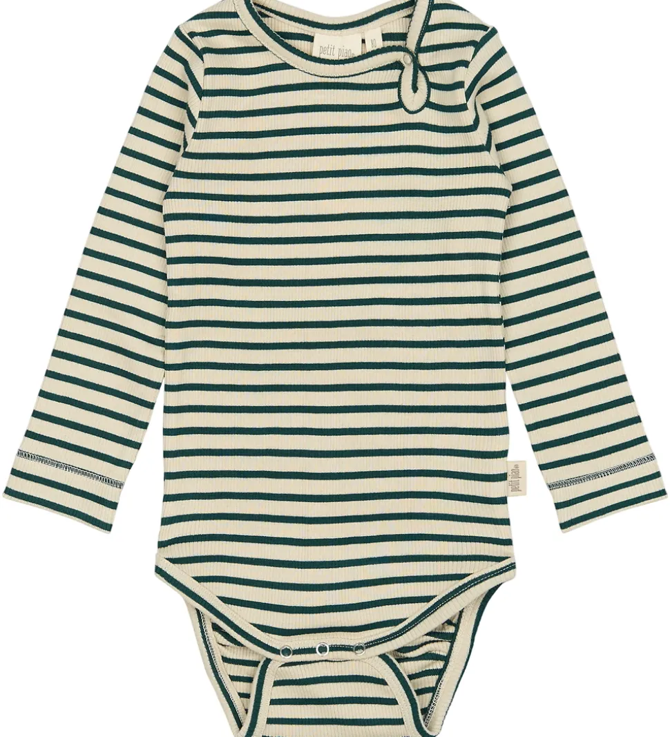 Elegant Petit Piao body med lange ærmer i beige med mørkegrønne striber. Farverne er en harmonisk kombination af grøn og creme, der giver et tidløst udtryk. Bodyen er udført i en ribbet struktur, som tilføjer en fin detalje til designet.
