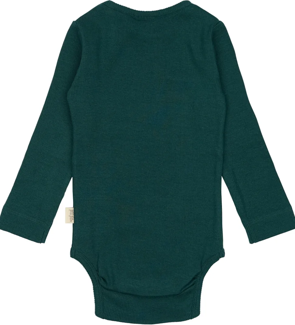 Charmerende Petit Piao body i en dyb grøn nuance. Bodyen har lange ærmer og er fremstillet i en ribbet struktur, der tilføjer en fin tekstur. Halsudskæringen er rund med en praktisk lukning ved skulderen, hvilket gør påklædning lettere. Petit Piao bodyen lukkes med trykknapper i bunden, og ærmekanterne har en enkelt finish.