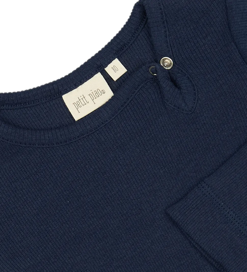 Elegant Petit Piao body med lange ærmer i en dyb blå farve. Bodyen har en fin ribstruktur, der tilfører et stilfuldt udtryk. Petit Piao har designet den med en rund halsudskæring, som bidrager til et klassisk look.