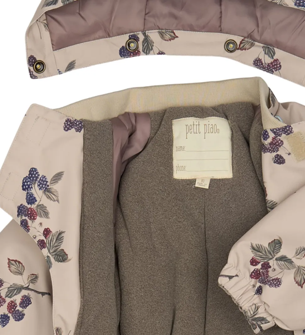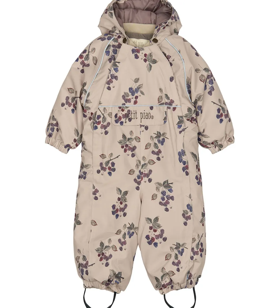 Skøn Petit Piao flyverdragt i beige med et alloverprint af brombær. Flyverdragten er med praktiske reflekspipings og et broderet logo fortil.