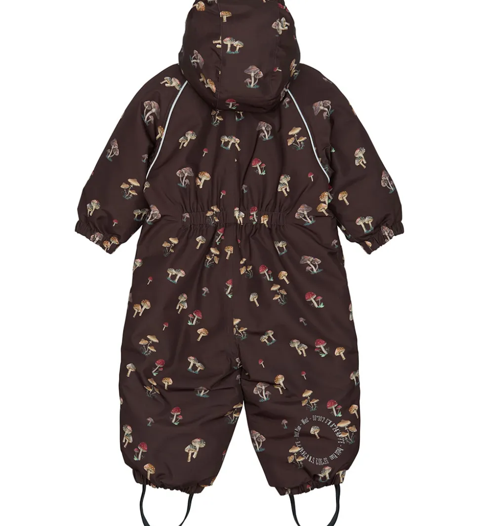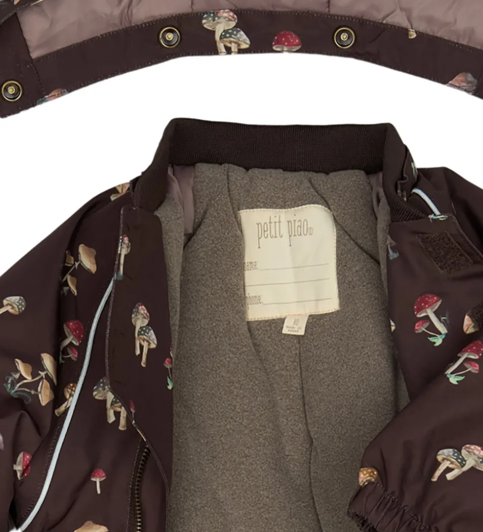 Skøn Petit Piao flyverdragt i brun med et alloverprint af svampe i afdæmpede farver. Flyverdragten er med praktiske reflekspipings og et broderet logo fortil.