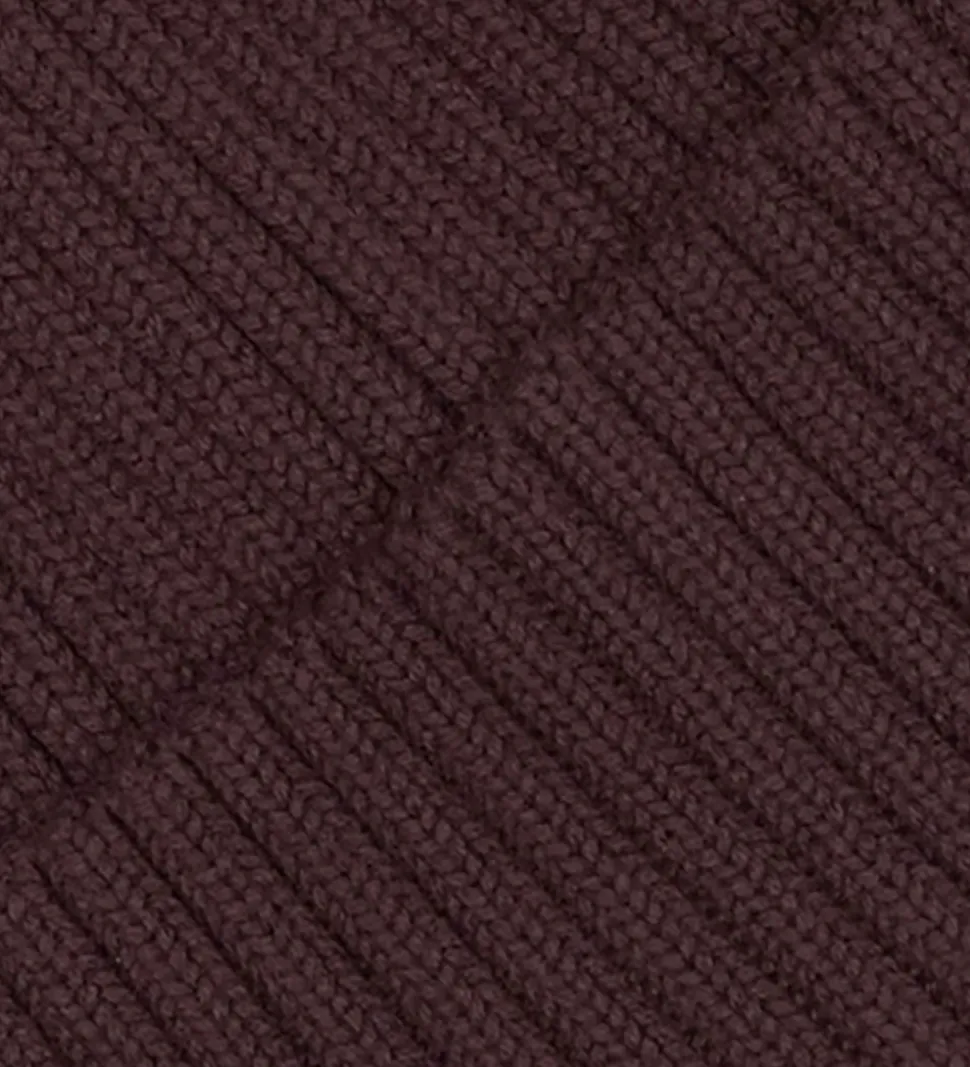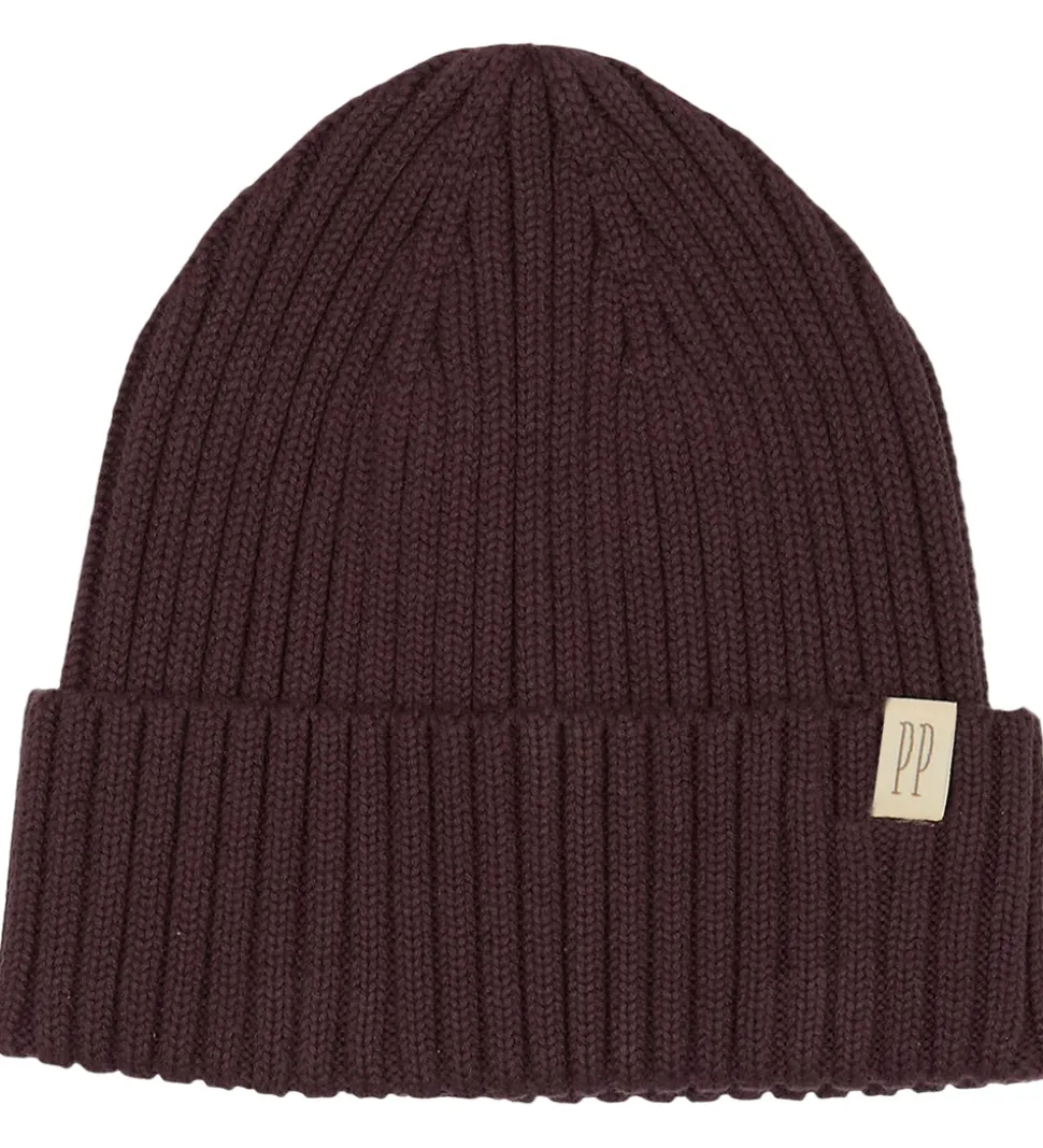 Flot Petit Piao hue i en dyb brun farve med ribstruktur, der giver en stilren effekt. Huen har et simpelt label med initialerne “PP” i en lys nuance, diskret placeret på kanten. Petit Piao hue kombinerer enkelhed og funktionalitet i sin design.