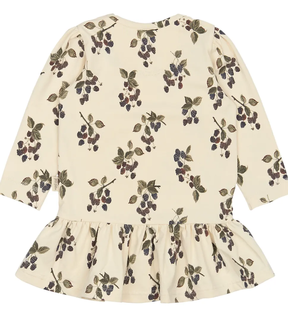 Elegant Petit Piao kjole med et smukt mønster af brombær og blade. Kjolen har en cremefarvet baggrund, der fremhæver motivet. Petit Piao kjolen har lange ærmer og en rund halsudskæring. Underdelen har en let flæsekant, der tilføjer en diskret elegance. Kjolen åbnes ved den venstre skulder med en trykknap.
