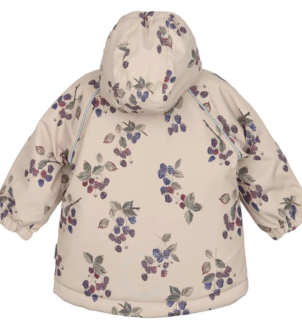 Skøn Petit Piao vinterjakke i beige med et alloverprint af brombær. Vinterjakken er med praktiske reflekspipings og et broderet logo fortil.