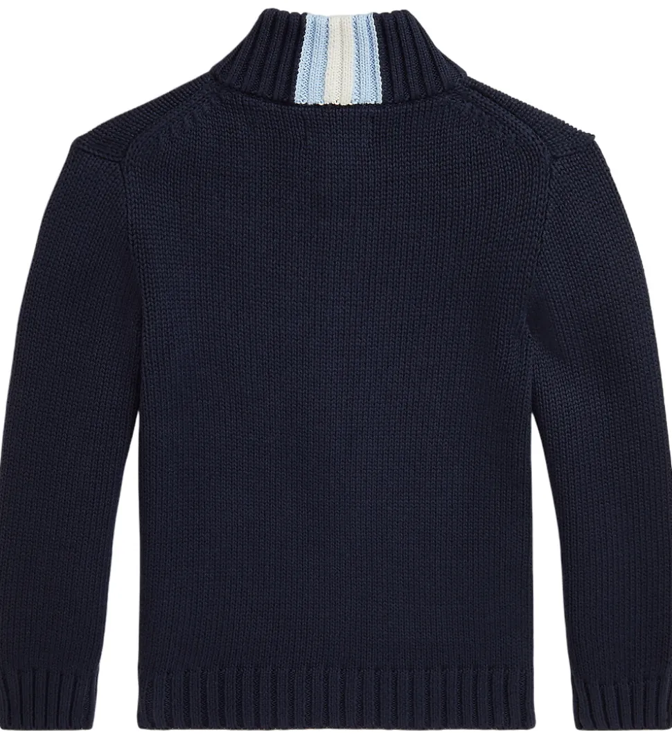 Flot cardigan fra Polo Ralph Lauren i navy bomuldsstrik, og i nakken er der hvide og lyesblå striber. Cardiganen har en høj hals, og den har brede ribkanter. Den åbnes med en skjult lynlås, og fortil sidder der to lommer.
