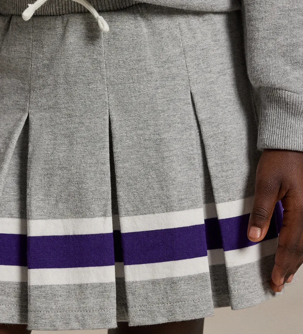 Smart Polo Ralph Lauren tennisnederdel i meleret grå, og langs den nederste kant er der en bred, lilla stribe med hvide striber.