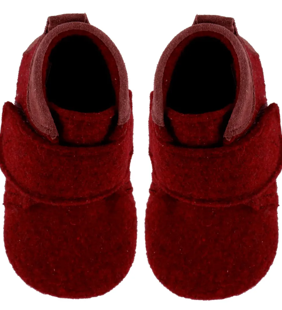 Fine Pom Pom hjemmesko i bordeauxrødt uld, med en fin detalje af rødt ruskind på hælen.