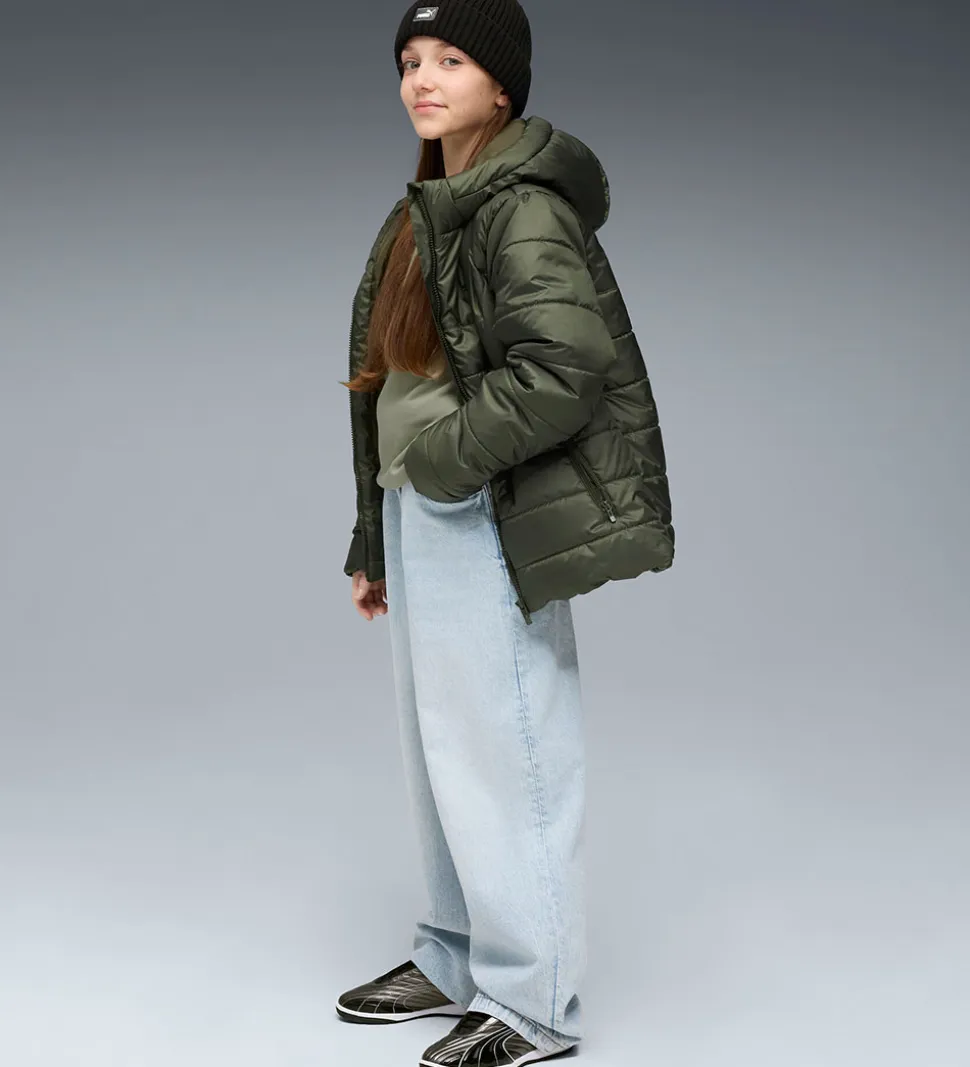 Sej Puma dynejakke i mørk olivengrøn med vandrette syninger og med et logoprint på venstre bryst.