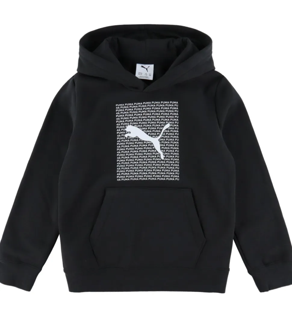 Sej Puma hættetrøje i sort med et stort print på fronten af en masse små, hvide Puma-logoer med et stort logo i midten. Hættetrøjen har en blød hætte og en rummelig kængurulomme. Den har lange ærmer med ribkanter i ærme- og taljeåbning. Indvendigt er der blødt, børstet bomuld.