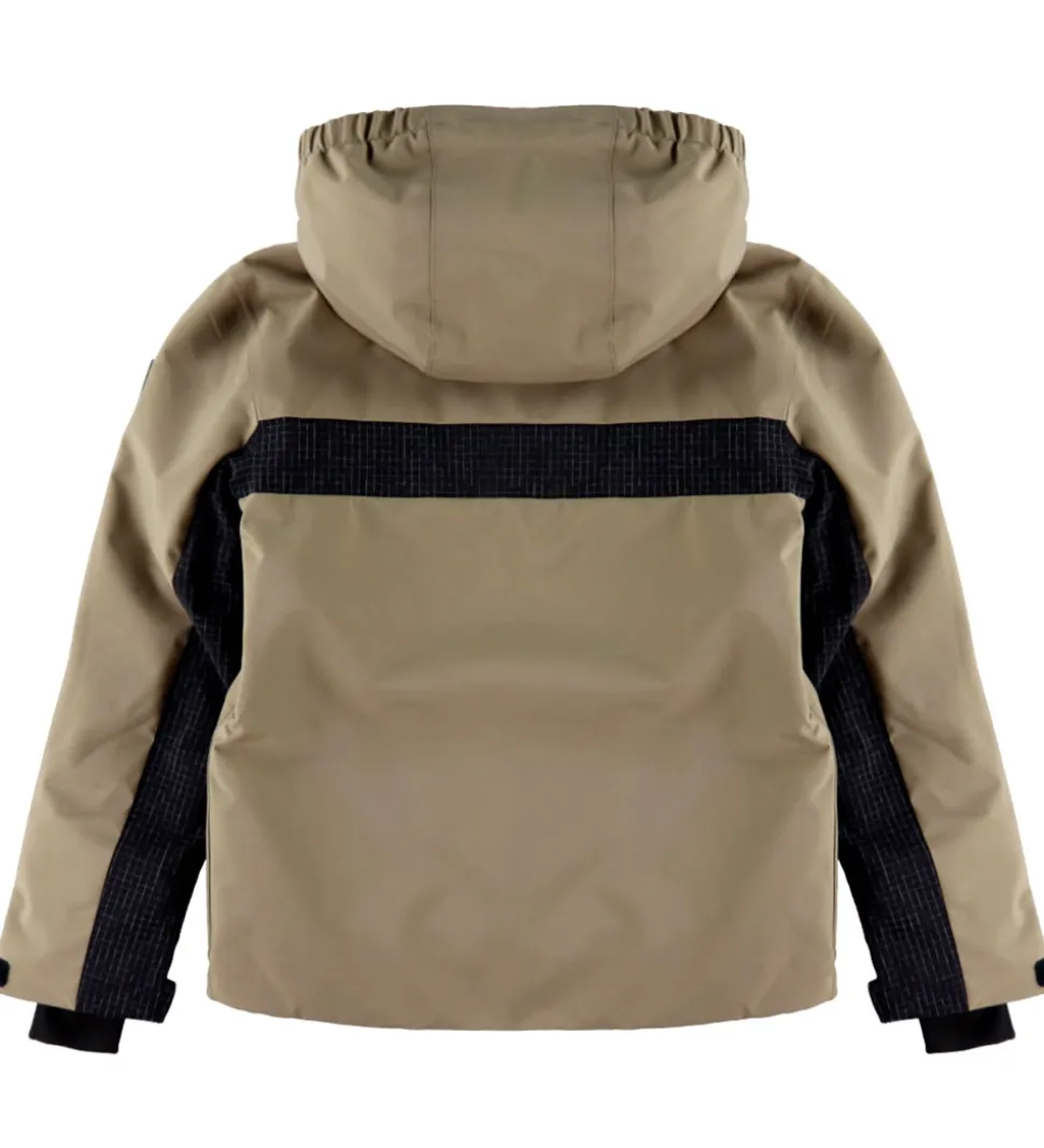 Smart Quiksilver vinterjakke i lysebrun, og på ærmerne og rundt om brystet er der en bred, sort stribe med et ternet mønster.