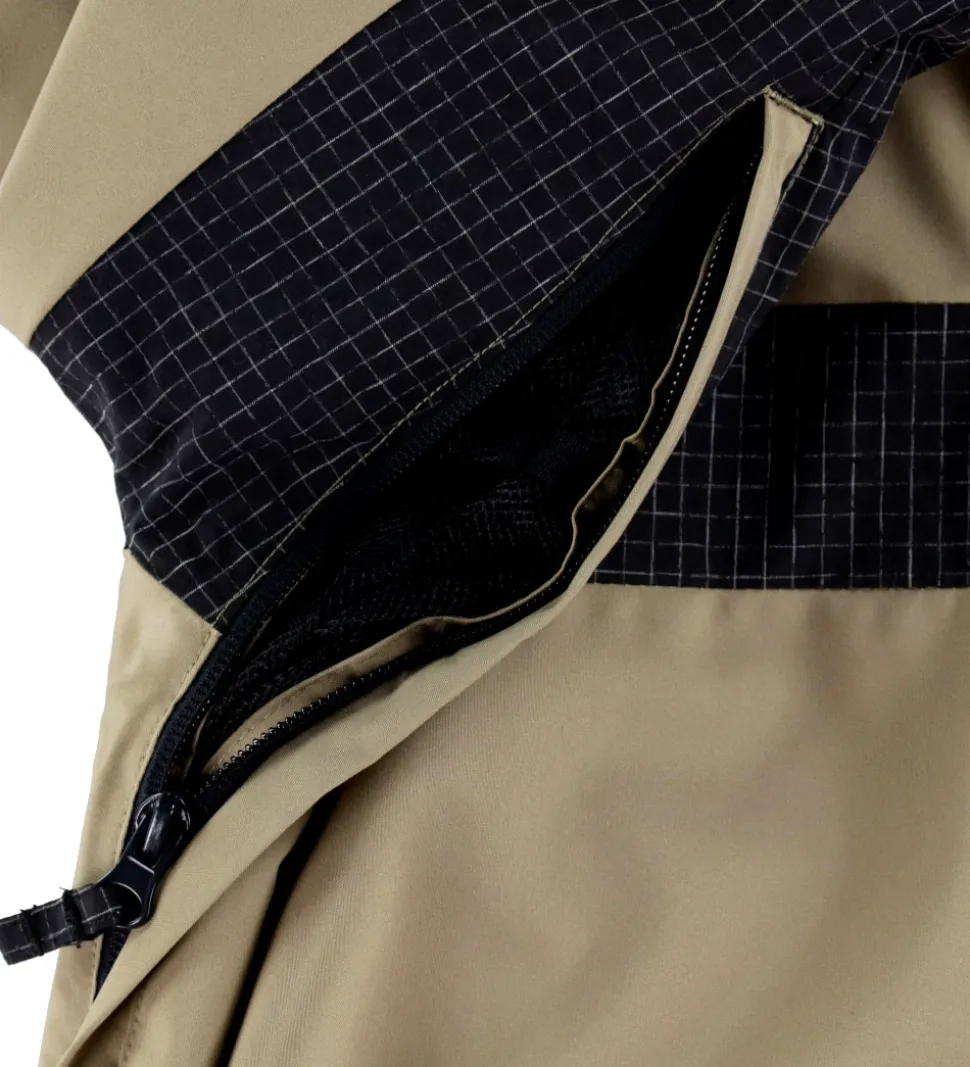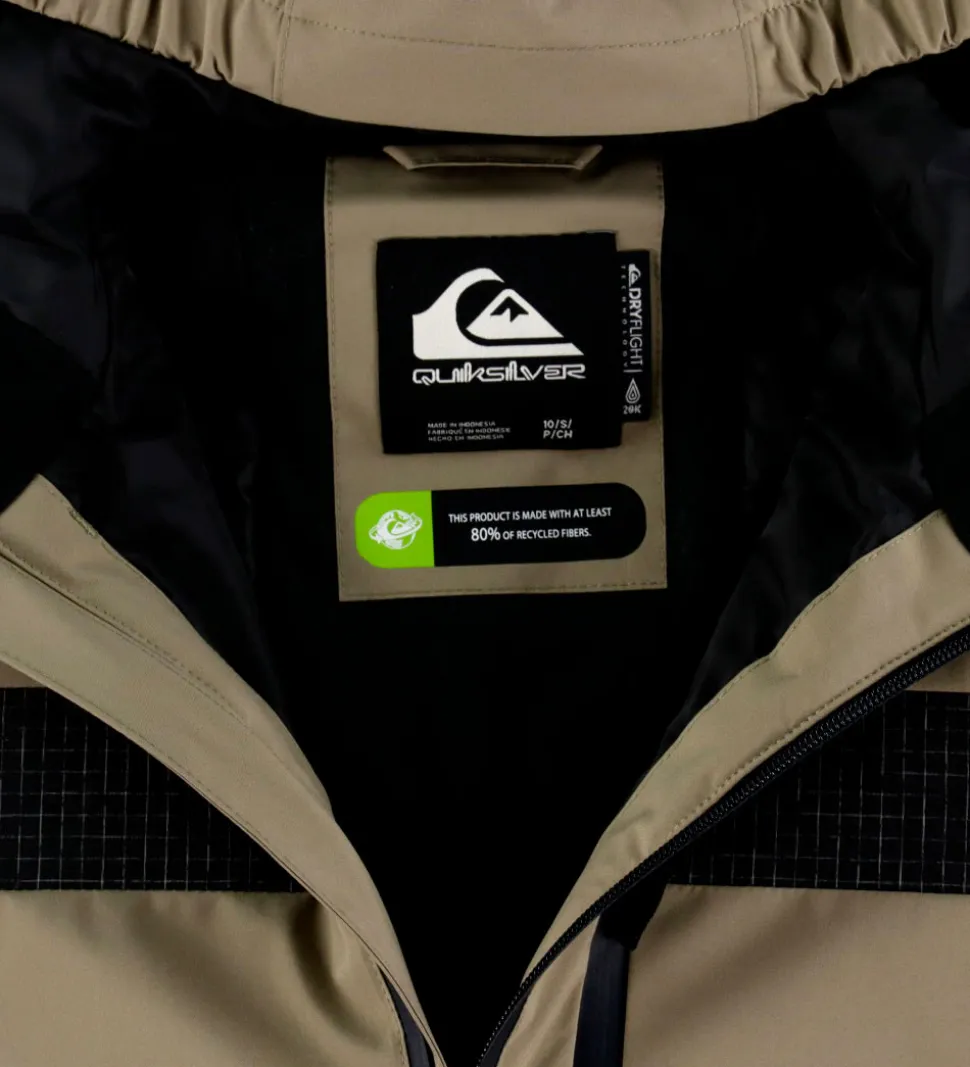 Quiksilver vinterjakken lukkes med en lynlås med gummilukning, hagebeskytter og indvendig vindstolpe. Fortil sidder der to fleeceforede lommer, som lukkes med en skjult lynlås, og i venstre side er der en brystlomme, som lukkes med en lynlås med gummilukning. I højre side er der to inderlommer, der lukkes med velcro, og yderst på venstre ærme er der en mindre lynlåslomme til f.eks. et liftkort.