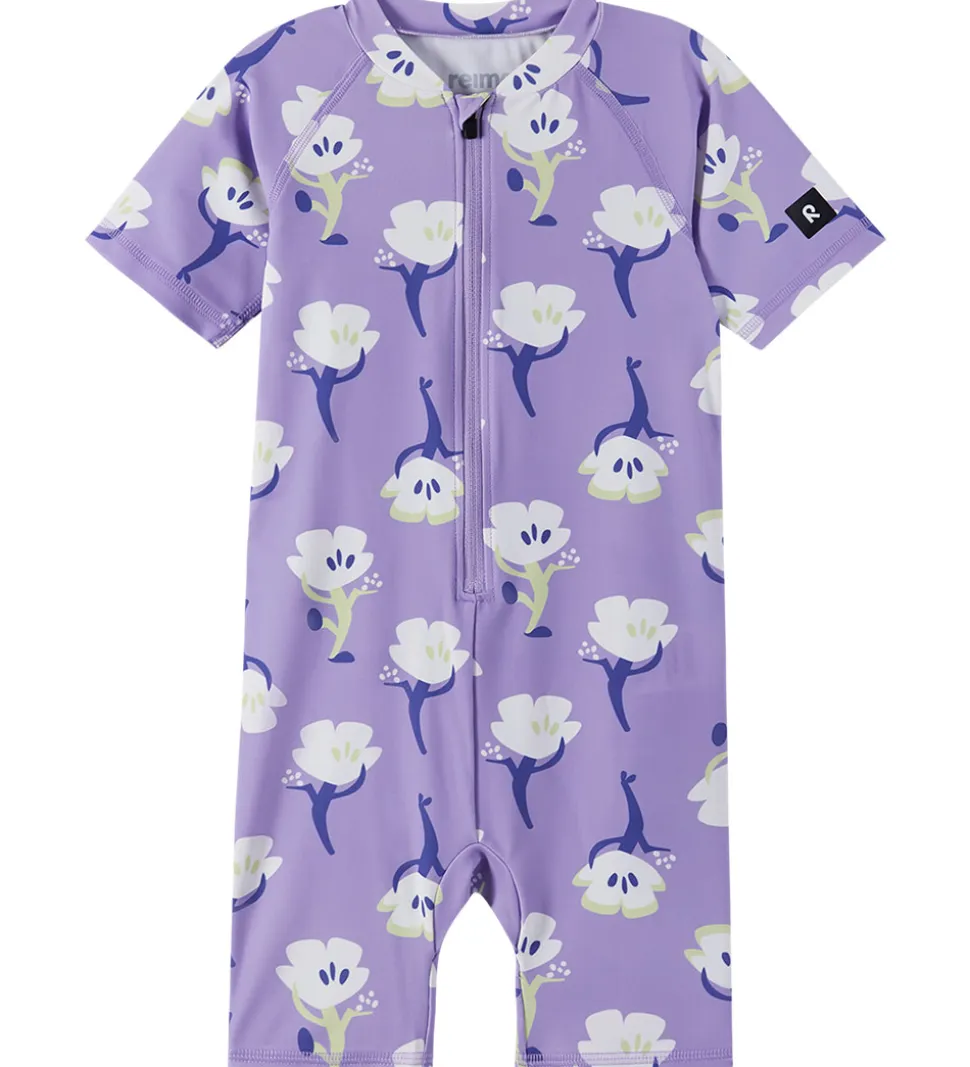 Lækker Reima badeheldragt i en lys lilla med et abstrakt blomstermotiv, der tilføjer et legende touch. Det er en komfortabel og praktisk løsning til vandleg.