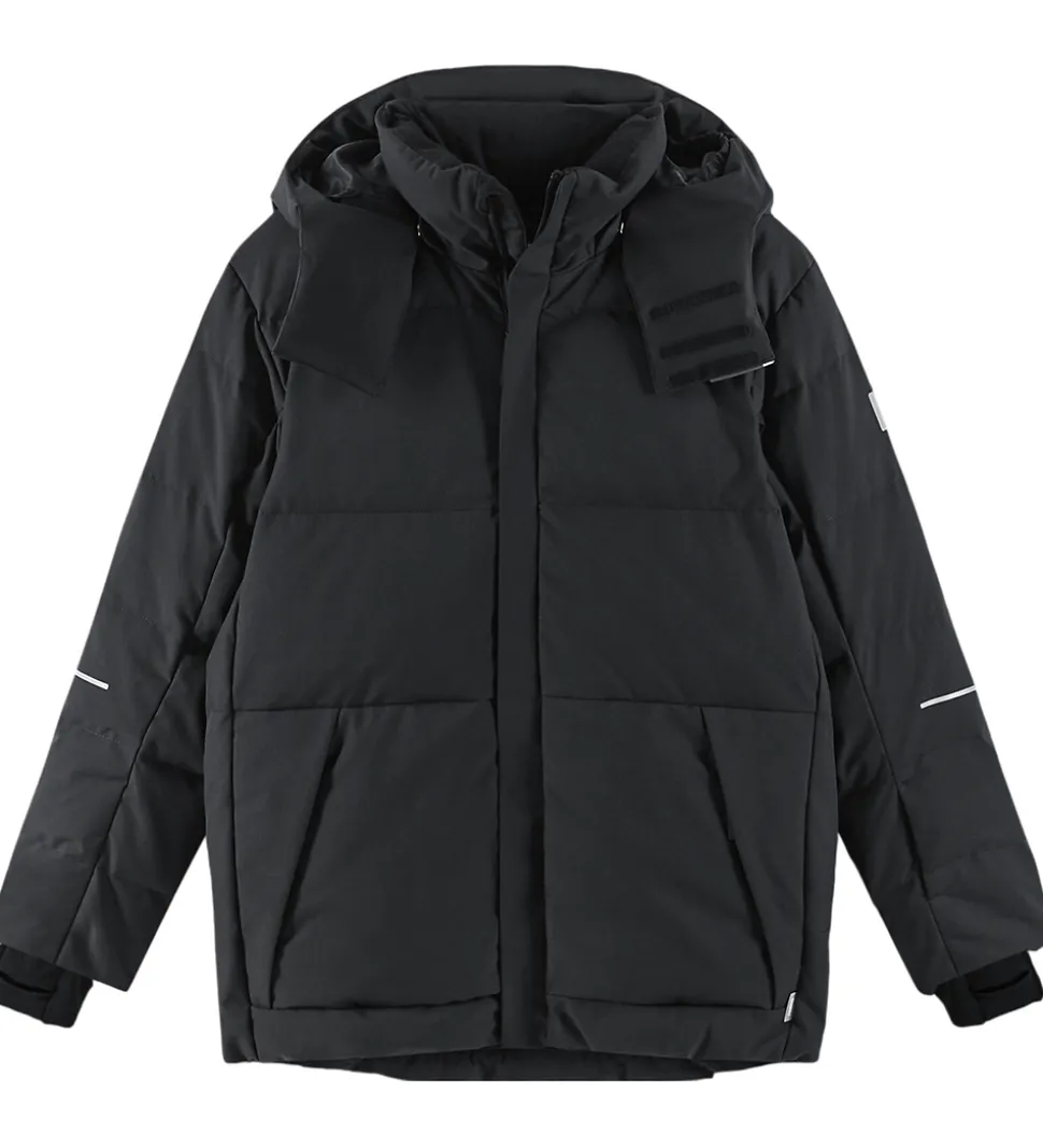 Reima dunjakken har en aftagelig hætte, som sidder fast med skjulte trykknapper. Hætten lukkes foran hagen med velcro, og den kan justeres i toppen med en velcrorem. Ansigtsåbningen er med skygge og indvendig elastikkant. Ærmerne har snefang med brede kanter og hul til tommelfingeren.