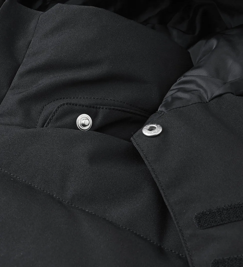 Dunjakken lukkes ved hjælp af en lynlås med hagebeskytter og dobbelt vindstolpe. Fortil sidder der to skrå lynlåslommer, der skjules af en fold. Omkring livet er der også snefang med gummibelægning og trykknapper.