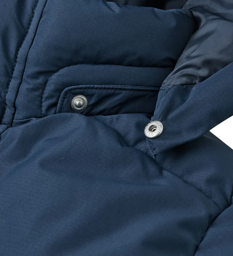 Reima dynejakken har en aftagelig hætte, som sidder fast med skjulte trykknapper omkring den høje halskrave, og ærmerne har praktiske elastikanter i åbningerne.