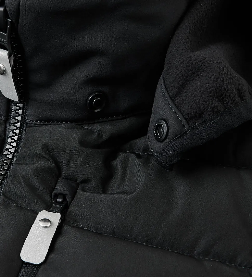 Dynejakken har en lun polyestervattering, og hætten, ærmerne og siderne er lavet softshell med blødt fleece på indersiden. Dynejakken har praktiske reflekser.