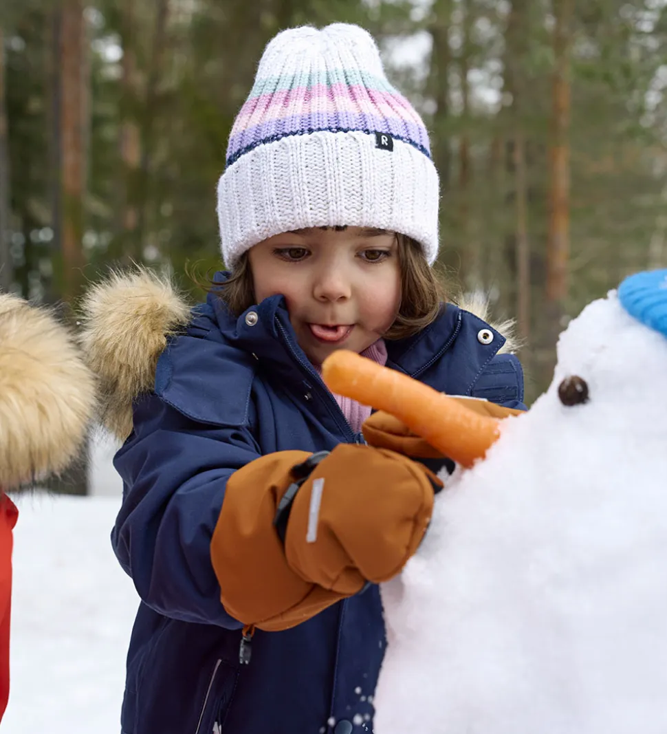 Reima flyverdragten har en aftagelig hætte, som sidder fast med skjulte trykknapper, og pelskanten sidder fast med en lynlås. Hætten lukkes foran hagen med velcro, og den kan justeres i toppen med en velcrorem.