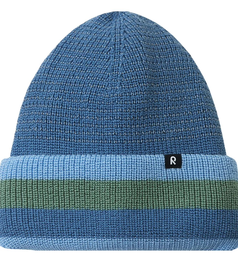 Elegant Reima hue i en blanding af blå nuancer og en grøn stribe. Huen har en ribstruktur med et diskret logo påskrevet på kanten. Huen er strikket i en blød blanding af uld og polyester og er i to lag. Reima designet sikrer et tidløst look, der fungerer i mange sammenhænge.
