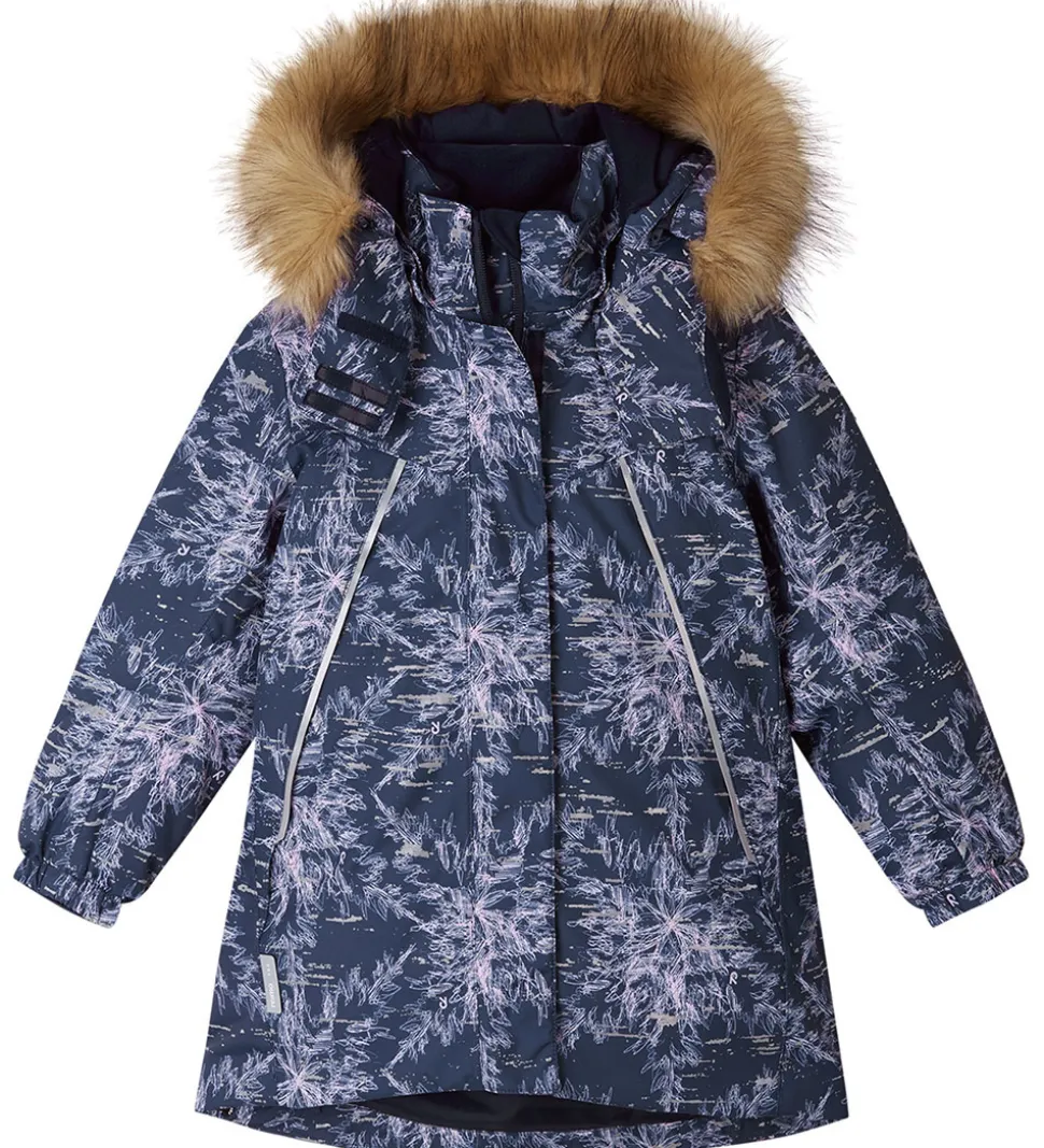 Reima vinterjakken har en aftagelig hætte, der er påsat med skjulte trykknapper. Den kan justeres i toppen og lukkes foran hagen med velcro. Hætten har en flot, imiteret pelskant, der kan lynes af med en skjult lynlås. Ærmerne har fleeceforede elastikkanter. Vinterjakken kan strammes ind i bunden med en justerbar elastiksnøre på indersiden.