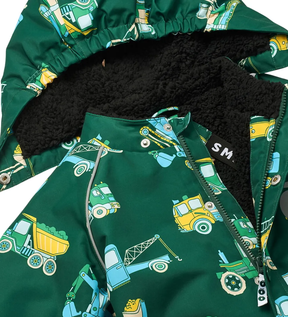 Skøn Småfolk flyverdragt i mørkegrøn med et alloverprint af farverige arbejdsbiler. Flyverdragten har lysegrønne forstrækninger og praktiske refleksdetaljer.