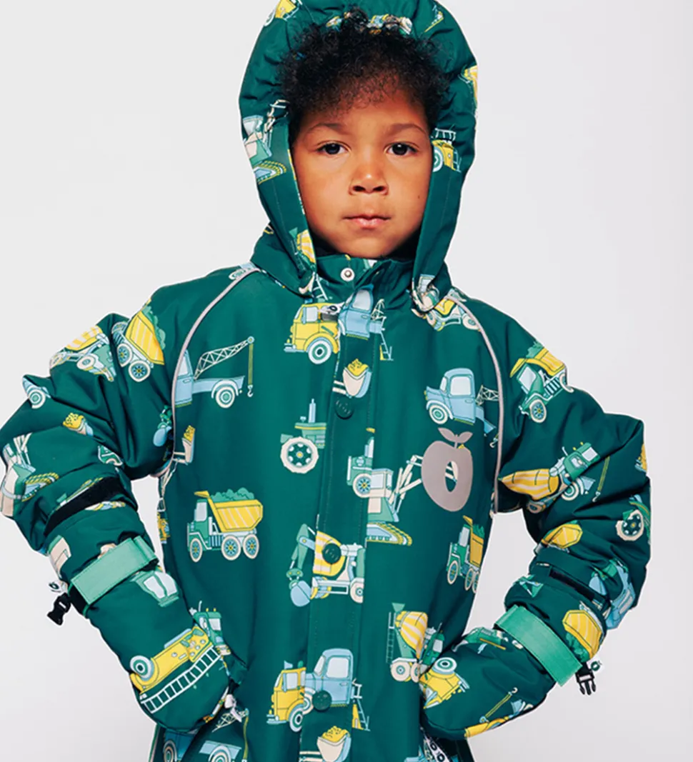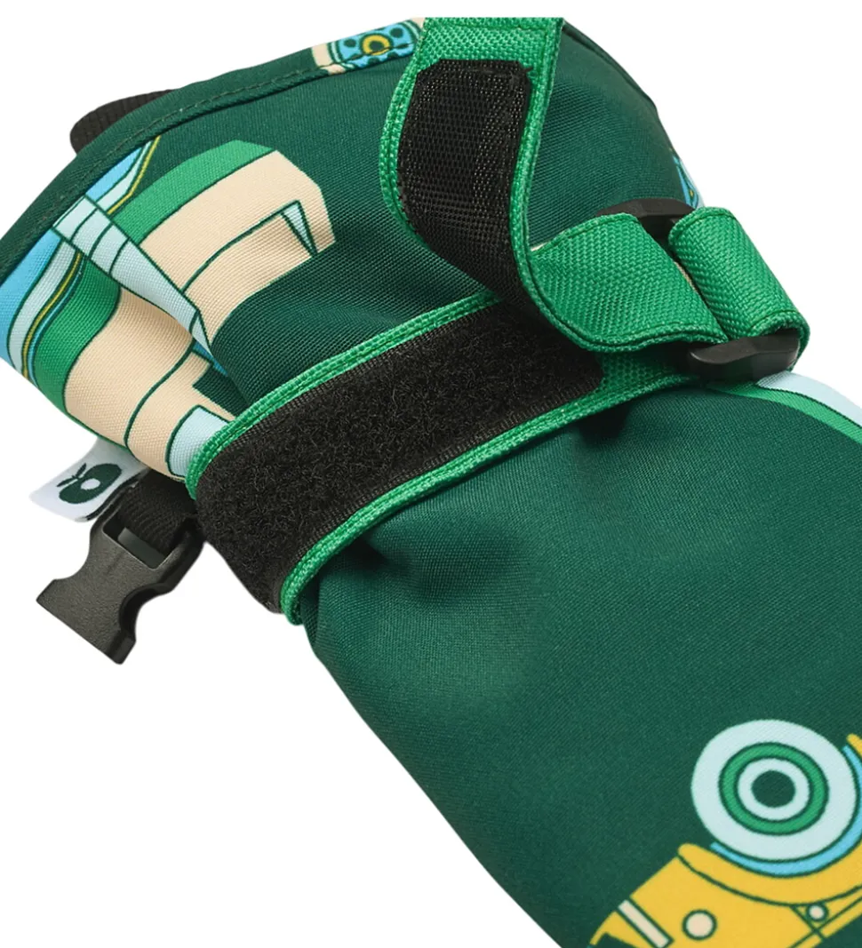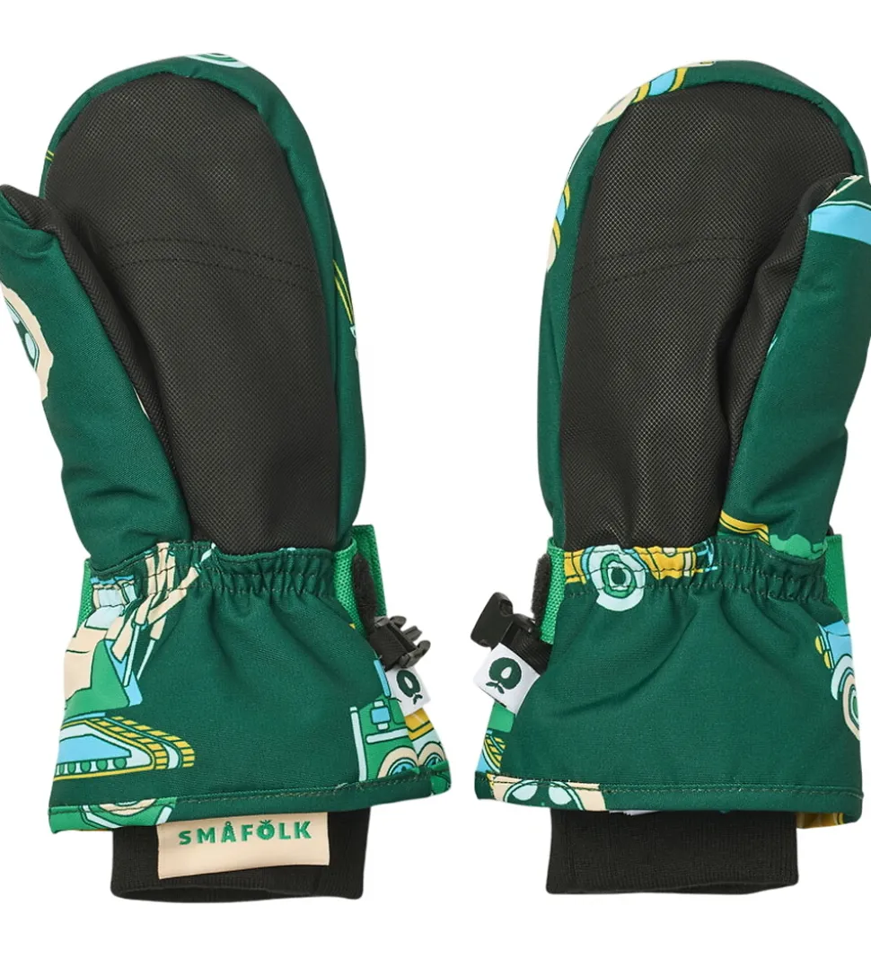 Lune Småfolk luffer i mørkegrøn med et alloverprint af farverige arbejdsbiler.